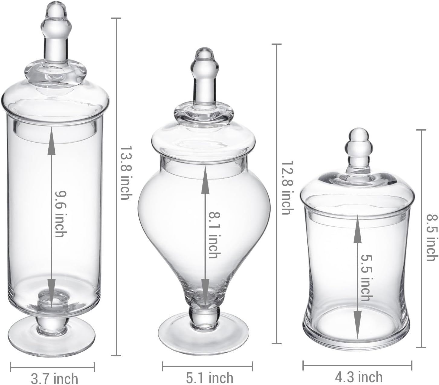 • Approximate Dimensions: Largest Jar- 13.8 H x 3.7 Diameter; Medium Jar - 12.8 H x 5.1 Diameter; Small Jar - 8.5 H x 4.3 Diameter (in inches)