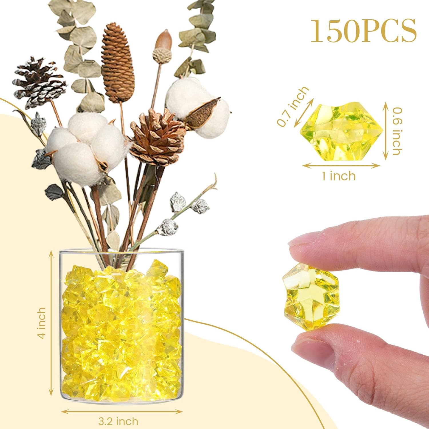 • Package includes 150 pcs yellow acrylic ice rocks.