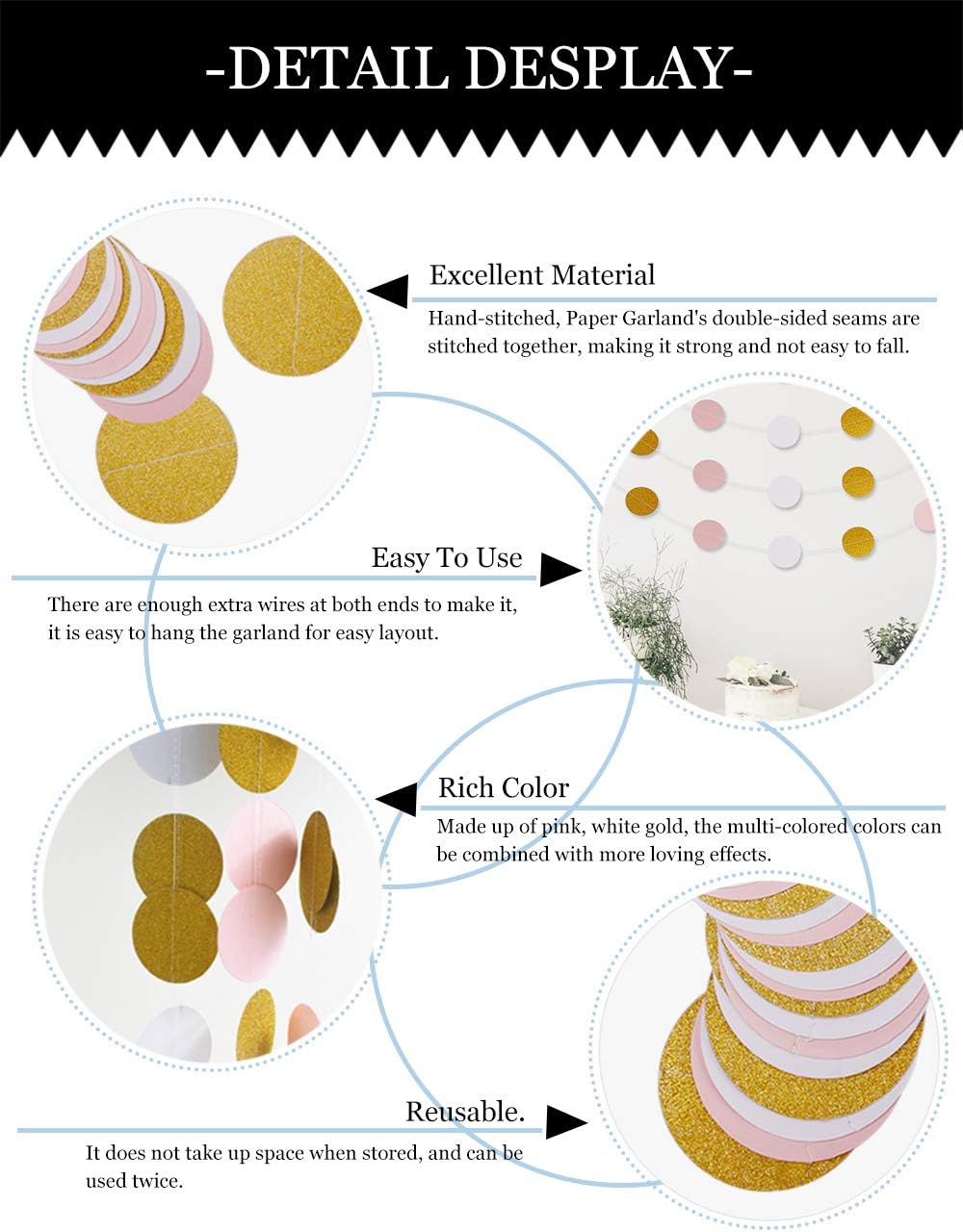 • How It'S Made: MerryNine Paper Garland is made of high quality card stock circle polka dots that is sewn together with double sturdy thread, each thread is sewn with 40pcs dots, each end has plenty of extra thread to makes it easy to hang the garland