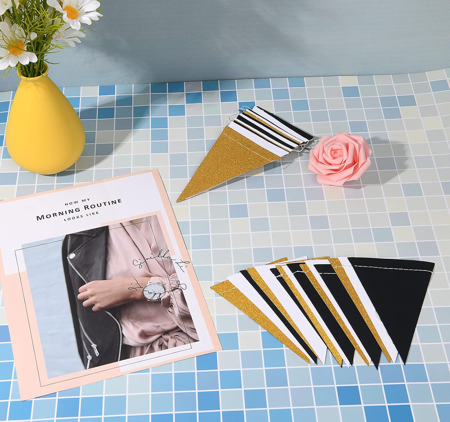 MerryNine Triangle Flag Bunting Banner, 3 Pack 30 Feet Vintage Style Pennant Banner for Wedding, Baby Shower, Event & Party Supplies 45pcs Flags (Triangle Flag - Black White Gold Glitter)
