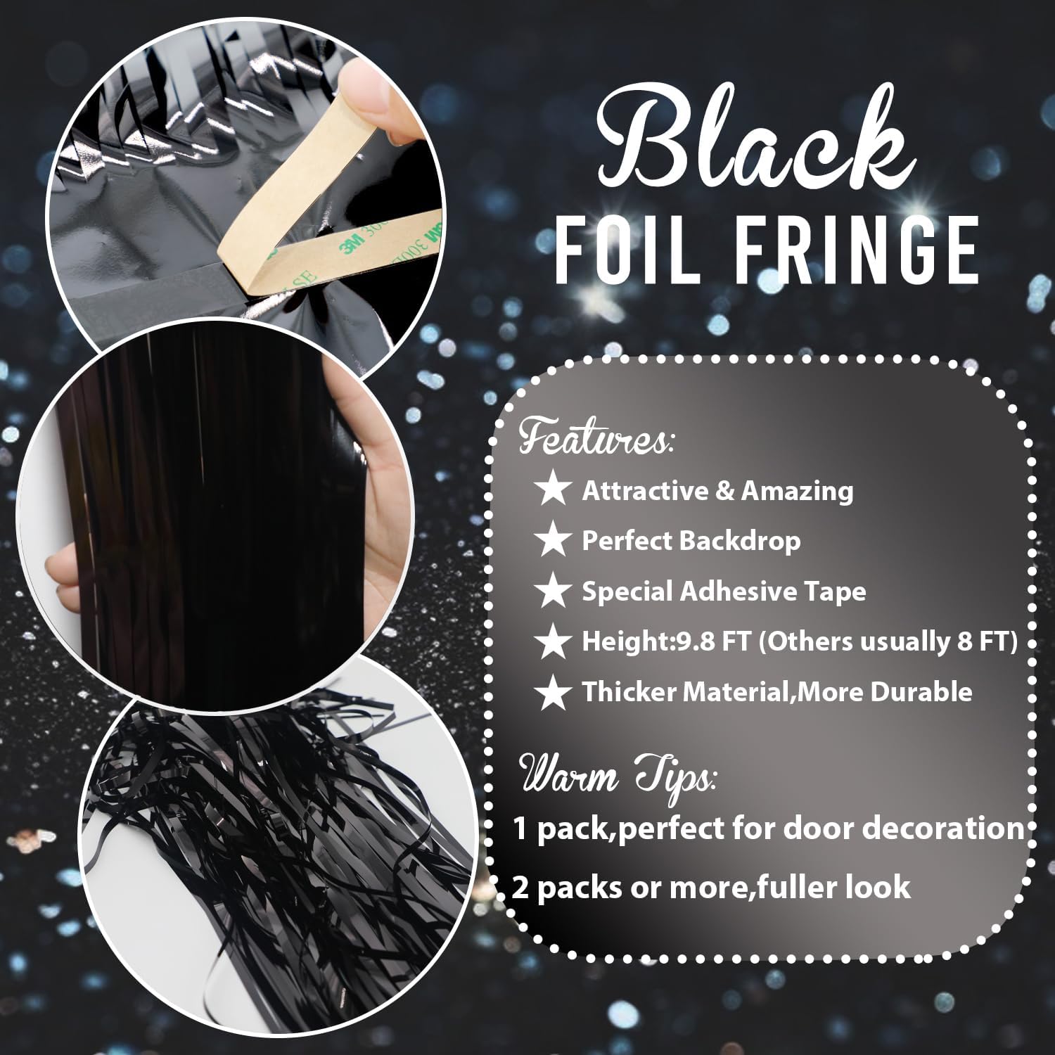 • Package Includes:1 pack black foil fringe curtain,3.2 ft x9.8 ft each,suitable for hanging on a door or coverage a wall fully