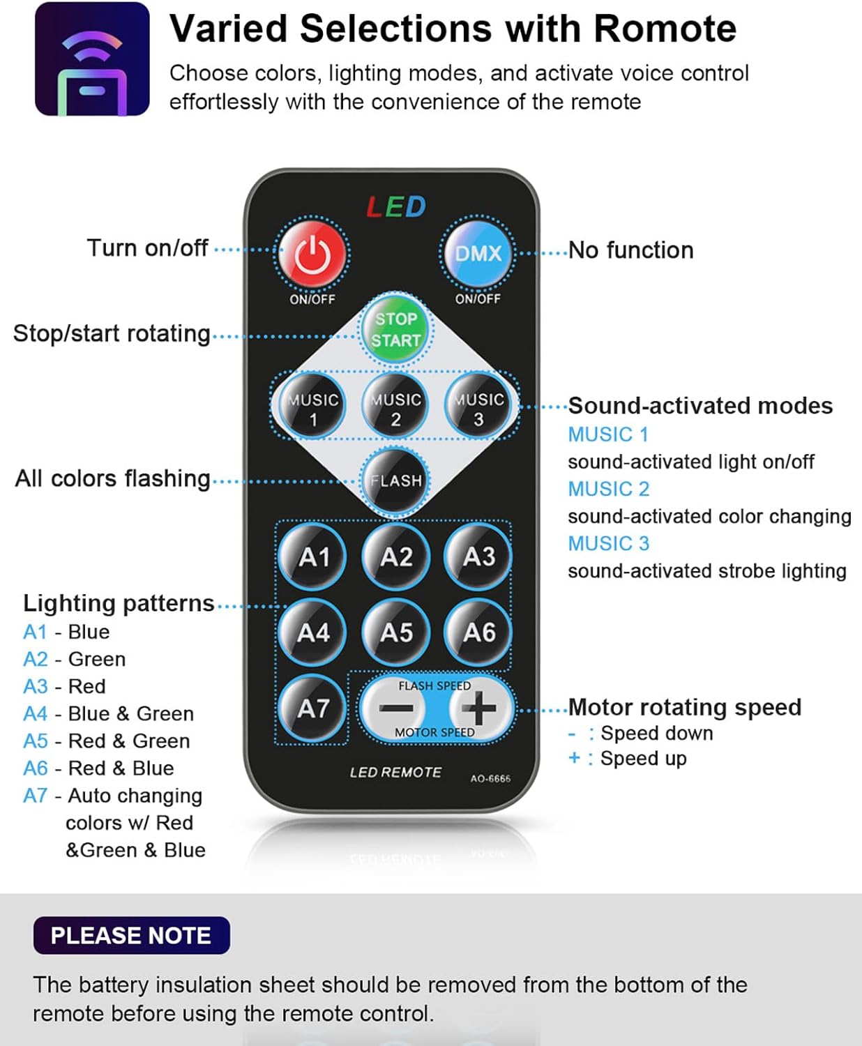 • Multi-functional sound activated party lights: 3 sound-activated modes + 7 lighting modes + Rotating speed control