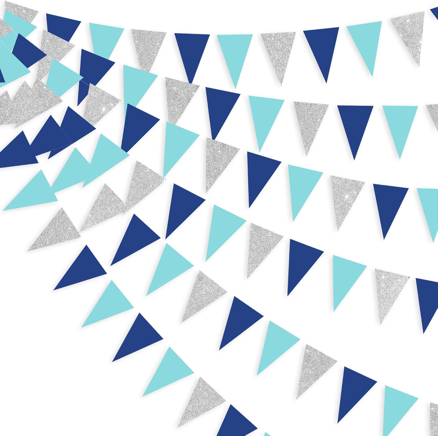 • 🤍SPECIAL DESIGN -Our silver blue triangle flag garland banners are made of two environmental materials paper alternately.Double sided glitter paper and cardstock with neat cut,strong,won't come unstitched or broken easily.durable and reusable.