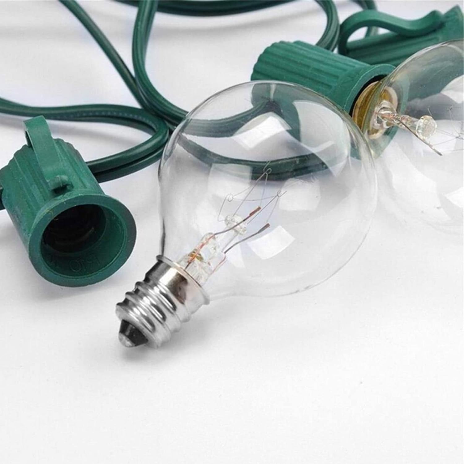 • G40 globe string lights are made of 25 feet long string used to connect 25 clear G40 Bulbs. 6” lead with male plug, 12” spacing between bulbs, 6” tail with female connector. Each strand has end to end connections, so that you will easily be able to attach up to 3 strands to cover large areas. Even with broken or removed bulbs, remaining bulbs will continue to light up