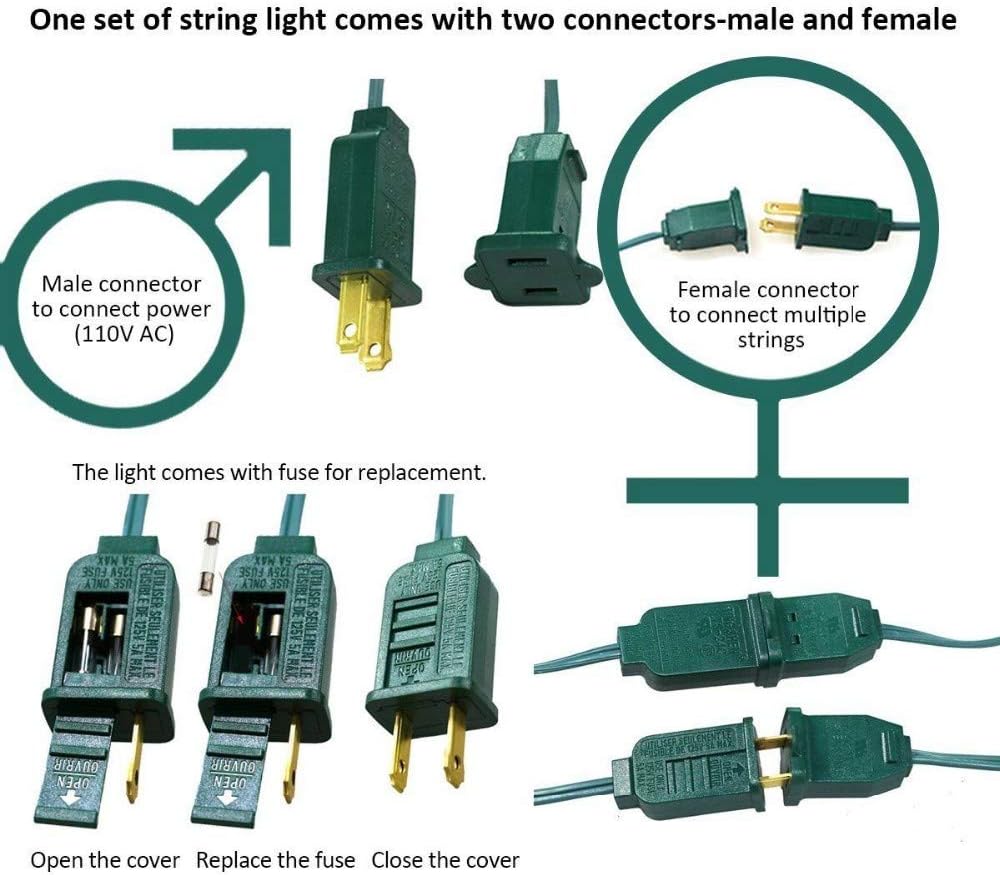 • Energy-efficient 5W bulbs, E12 candelabra base, 125W per string | 110V Power | Comes with Spare Fuse | UL Listed for general indoor/outdoor applications. Bulbs can be replaced by any Candelabra (E12) ones that single bulb not exceed 7W. Connects up to maximum 3 strands, total strand load that powered by one outlet can't exceed 432W