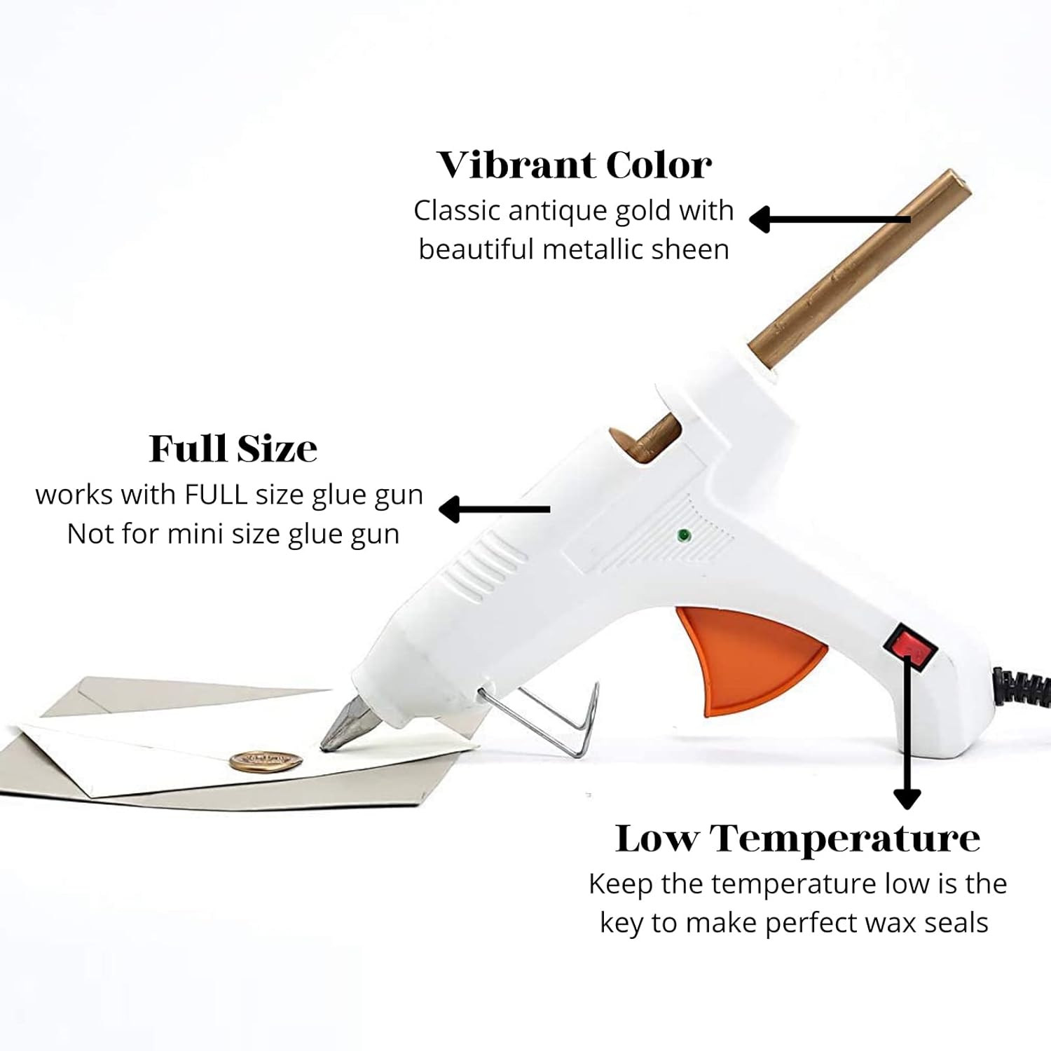 • Easy To Apply - Easily use together with a low-temp large standard 0.44" glue gun. Not designed for mini glue guns! If you plan to seal dozens of envelops, this is the most efficient method. To avoid the wax stuck to the stamp, you may put stamp on an ice pack in between every 4-5 impressions. Please remember the glue gun was designed for glue stick which requires a much higer melting temperature than the wax, so to keep the temperature low is the key.