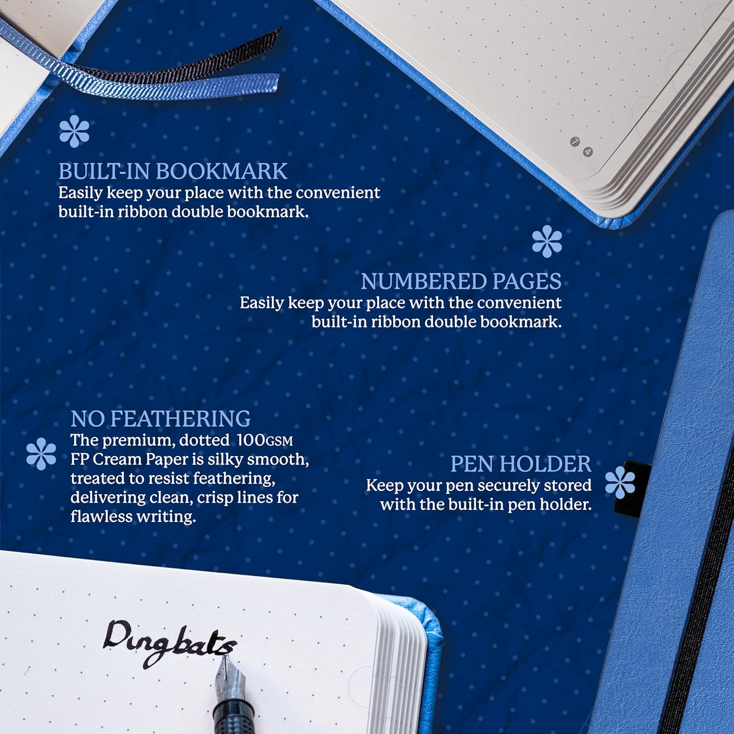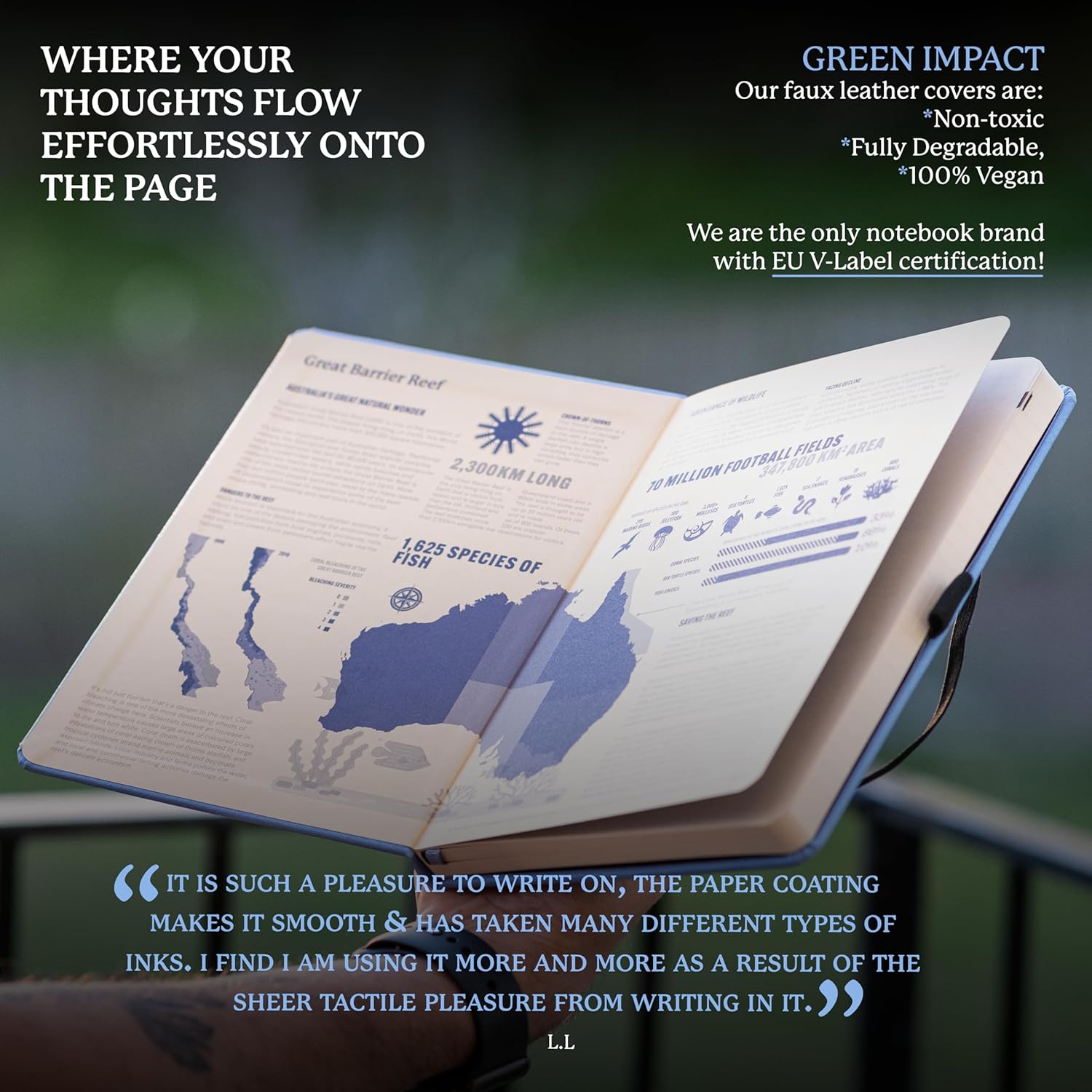 • A5 NOTEBOOK WITH LOTS O' FEATURES: Dingbats notebooks ooze quality - this hardcover bound leather notebook is crafted with PU vegan leather Cream 100gsm pages, 16 pages of perforated paper, an elastic closure and pen holder. It's complete with a silhouette of the Great Barrier Reef, an infographic spread about the endangered region in the endsheets and an inner pocket for a little added detail - the perfect gifts for loved ones