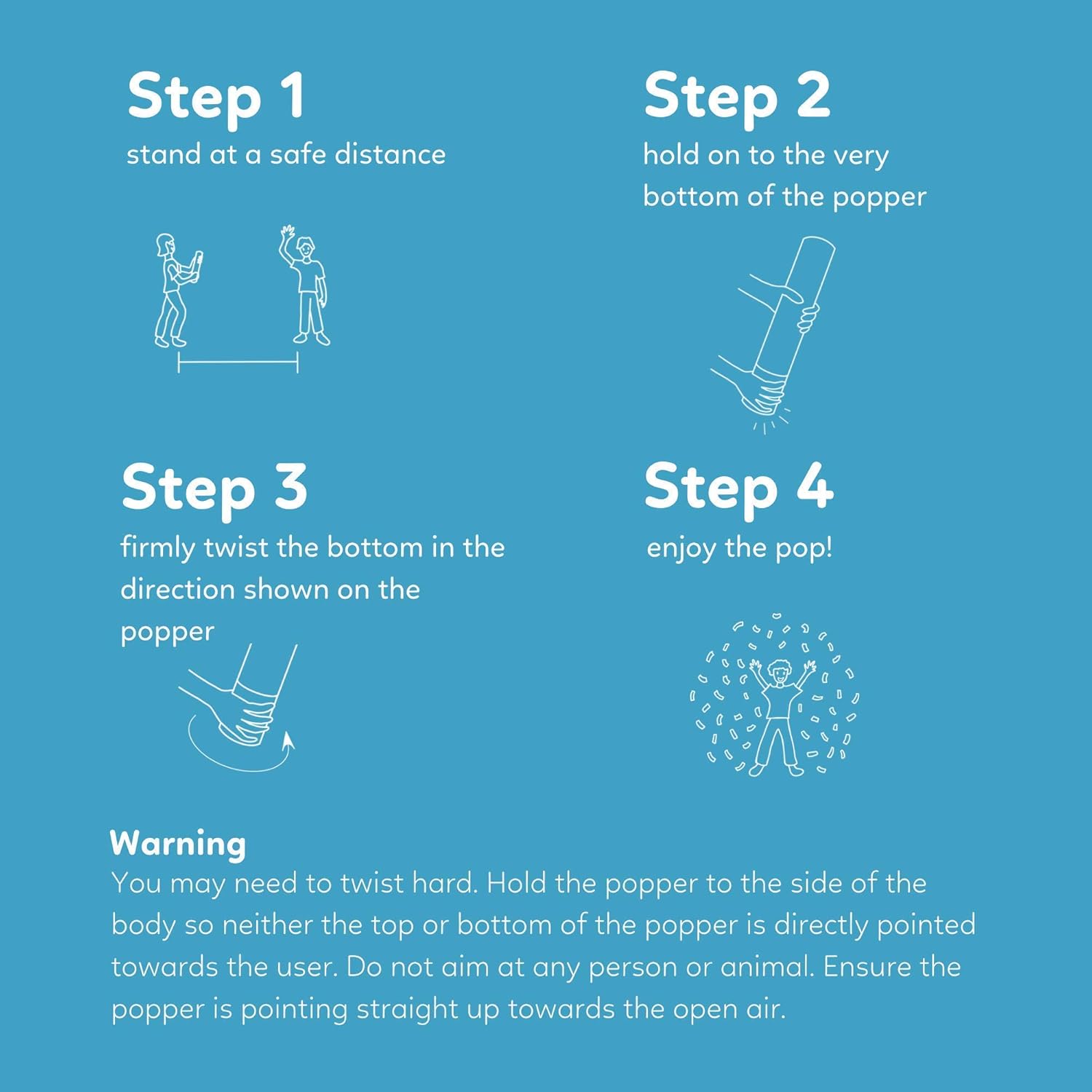 • EASY TO USE AIR POWER! Just a simple twist at the very bottom part of the cannon releases a beautiful display of multicolored confetti. Each cannon is built of a durable tube that is PACKED full of confetti for an exciting pop of confetti that flies up to 25 feet!