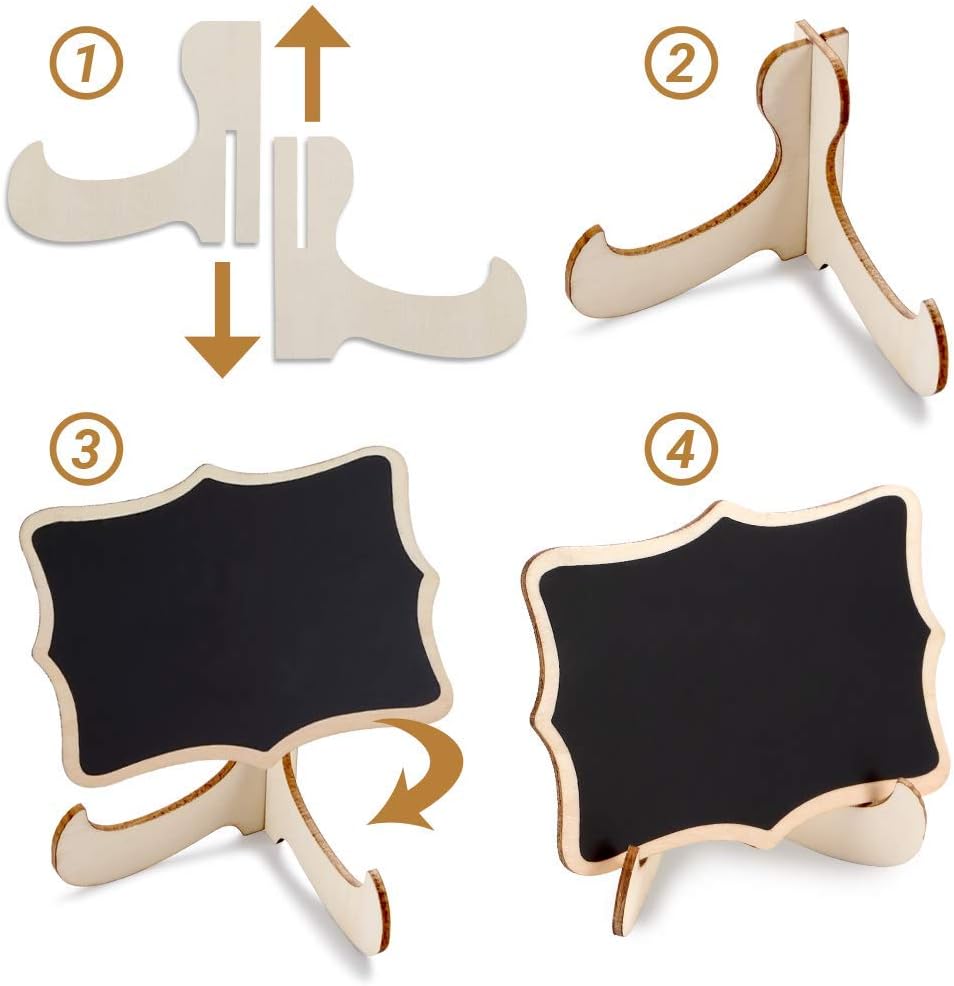 • Easy to Carry and Store: These awesome small blackboard signs have removable stands which allow them to stand up well on a table making them so convenient to use. The little easels can also be folded down flat, which makes them easy to store or carry. You can place the framed chalkboard horizontally or vertically and use them as wedding signs, table numbers, name tags, place cards, favor tags, plant decorative signs, food labels, and so on.