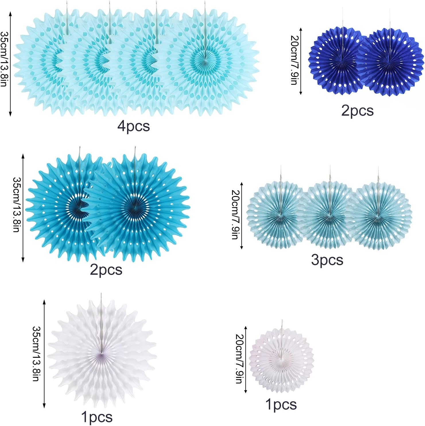 • Vibrant and Eye-Catching: These 13 PCS Blue White Hanging Paper Fans Party Decorations are designed to add a pop of color and excitement to any event or celebration. The combination of blue and white creates a refreshing and visually appealing atmosphere.