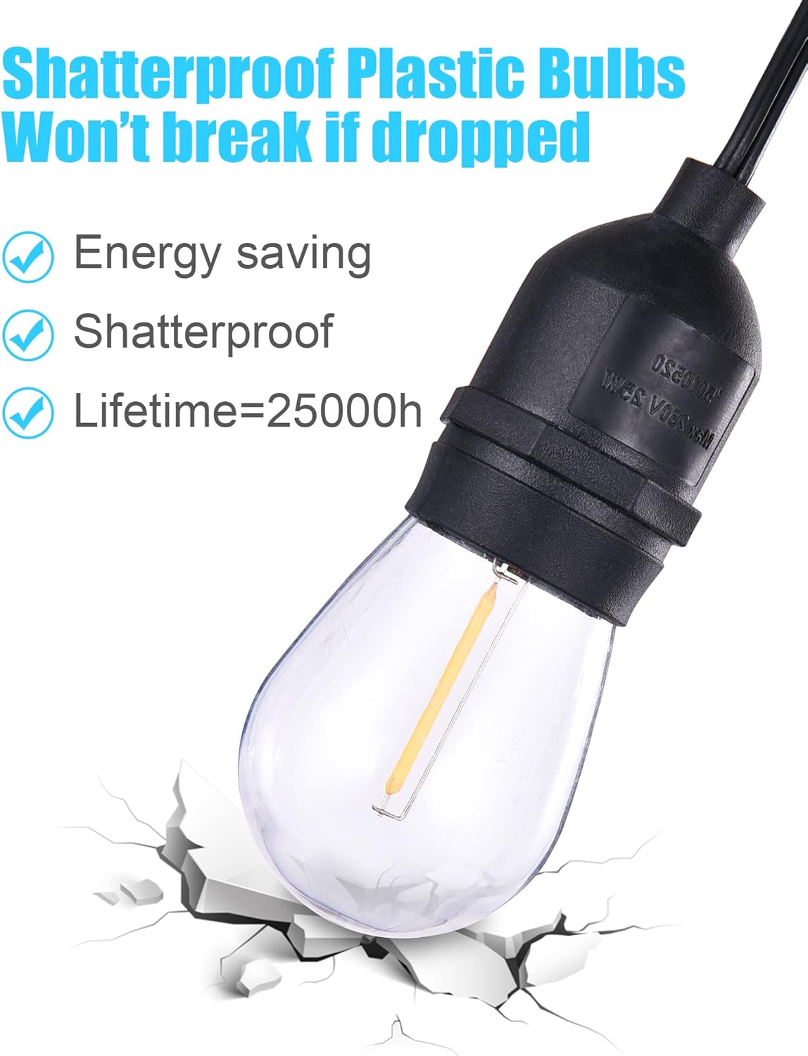 • Shatterproof Bulbs: Never stress when storm or hurricane set in because this outdoor patio string lights won’t broke if dropped. Comes with 26 shatterproof plastic bulbs, including 2 spares, to give you peace of mind all year round.