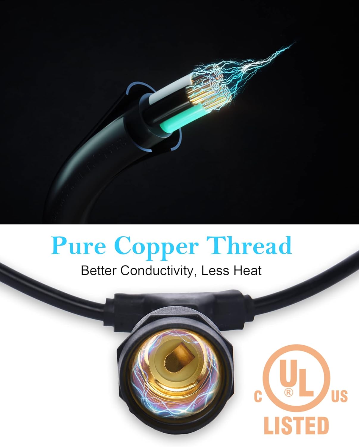 • Safe & Durable: UL-listed Edison bulb string lights are crafted from pure copper cord for better conductivity and reduced heat during hours of use. IP55 wet rated outdoor vintage string lights is safe to hang outside year round through the elements like rain, snow, wind, heat weather, frost etc.