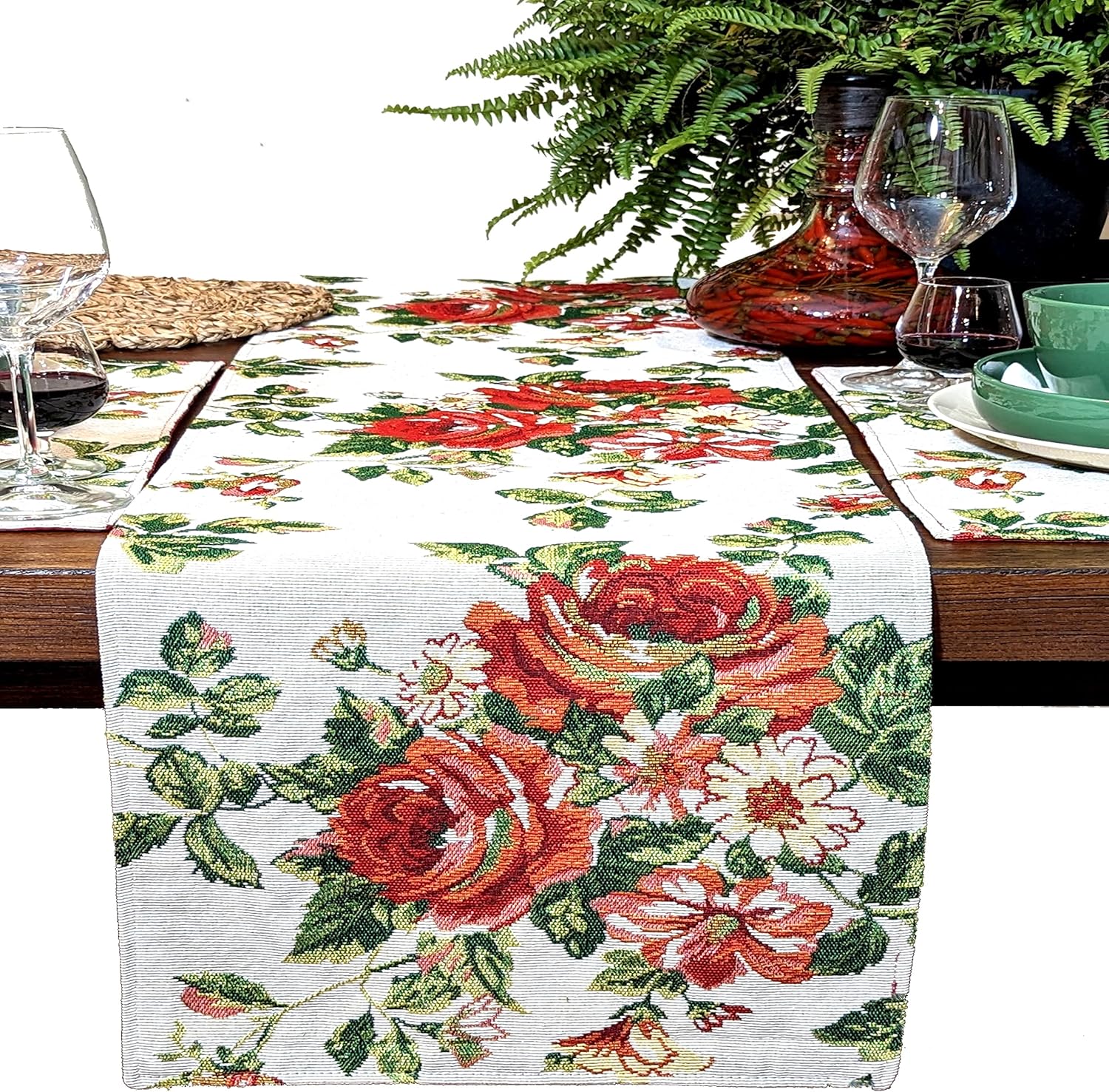 • This floral table runner features bouquets of roses surrounded by leaves and small flowers branching out of the bouquet and a light background to enhance the color of the roses. Colors are; ivory, creamy beige, ruby red, bright green, and light yellow.