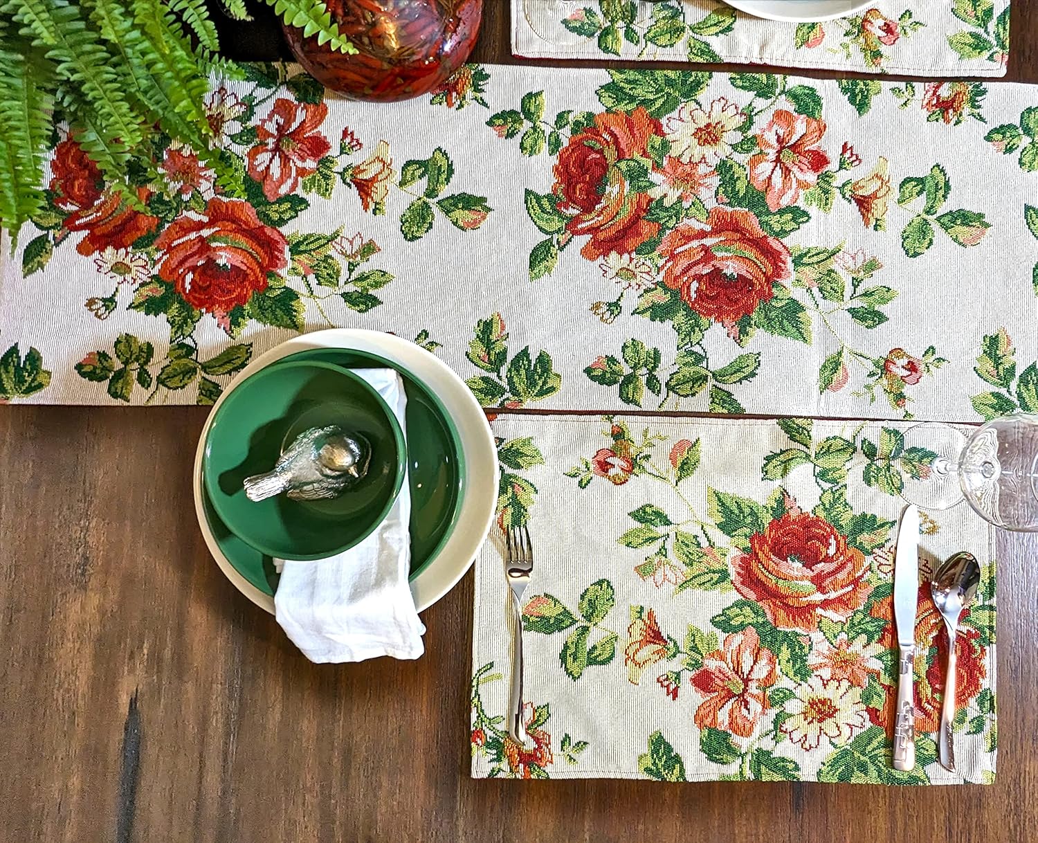 • This table runner features bouquets of antique roses surrounded by leaves and small flowers branching out of the bouquet and a light background to enhance the color of the roses. Colors are; ivory, creamy beige, ruby red, bright green, and light yellow.
