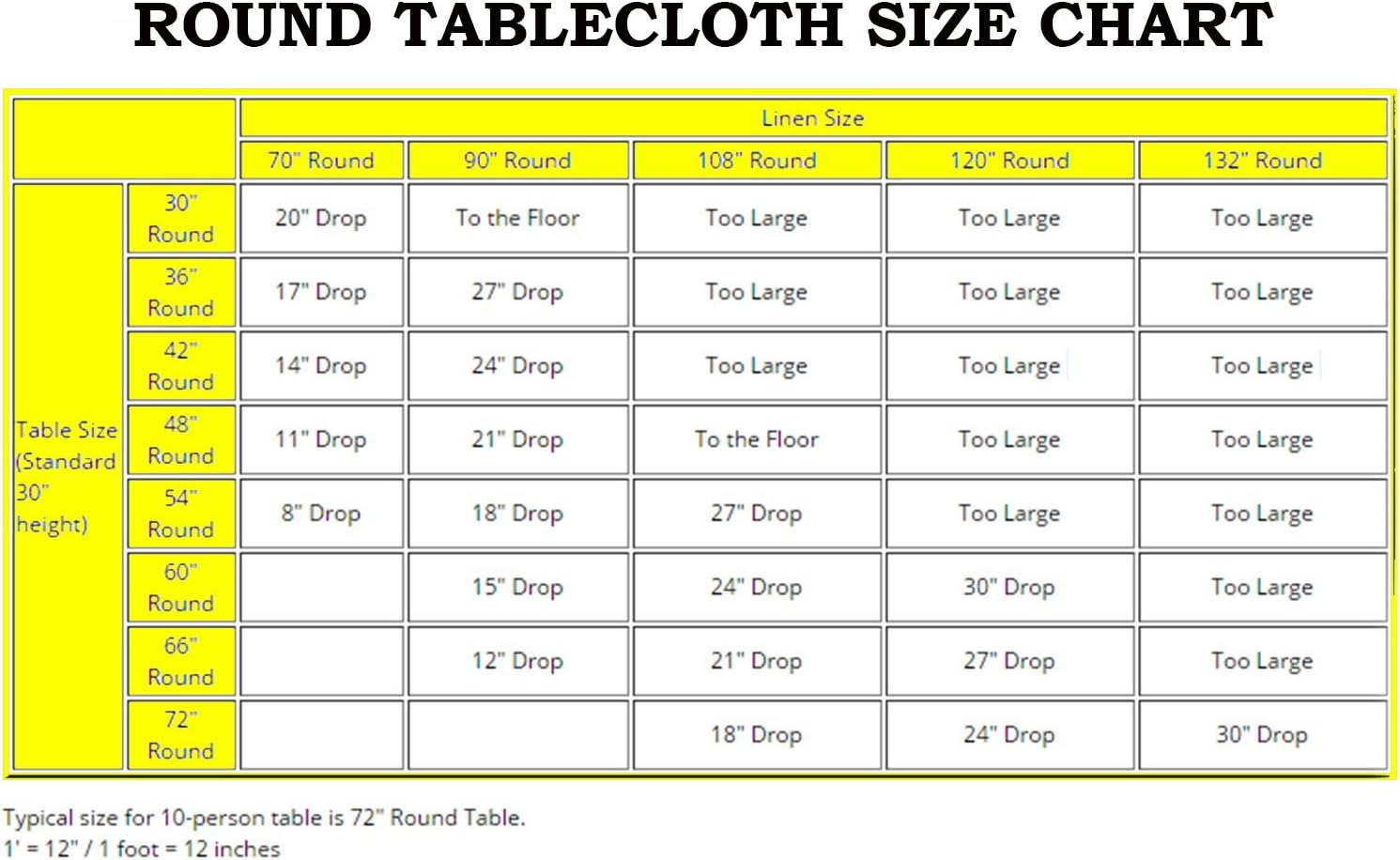 • Specification: Quantity: 1 Tablecloth Material: 100% Polyester Linens Size: 108" Stain & wrinkle resistant Seamless design, 1 pcs design. Perfect to be used on top of our tablecloths as accents. All sizes are approximate measurements How to Care: Warm water wash. Low temp dry. Can be reused again and again, easily over 100 times.