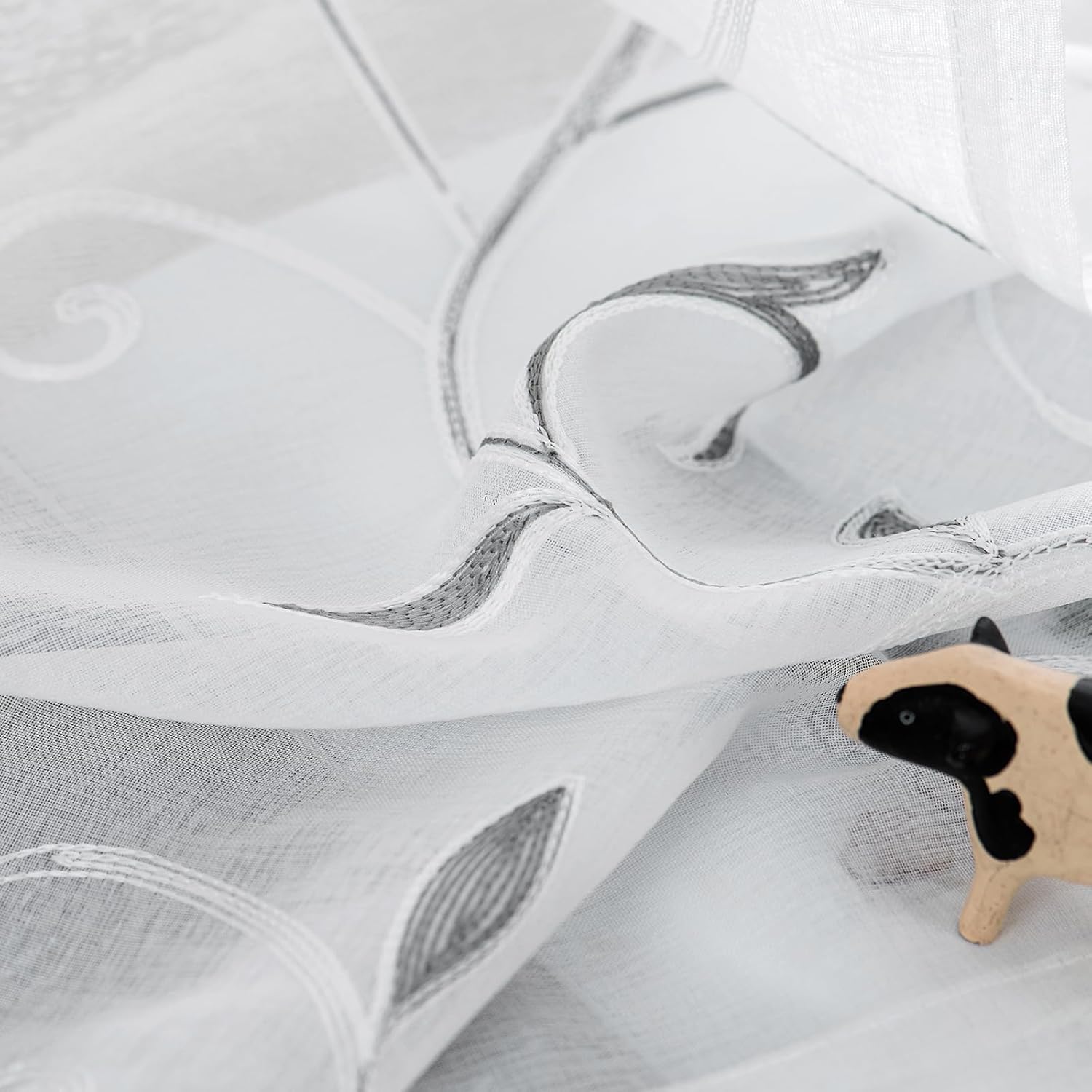 VISIONTEX White Sheer Voile Curtains Loop Embroidered, Decorative Grey Leaves Embroidery Faux Linen, Rod Pocket Window Drapes for Rustic Farmhouse Bedroom 54 x 84 Inch, Set of 2 Panels