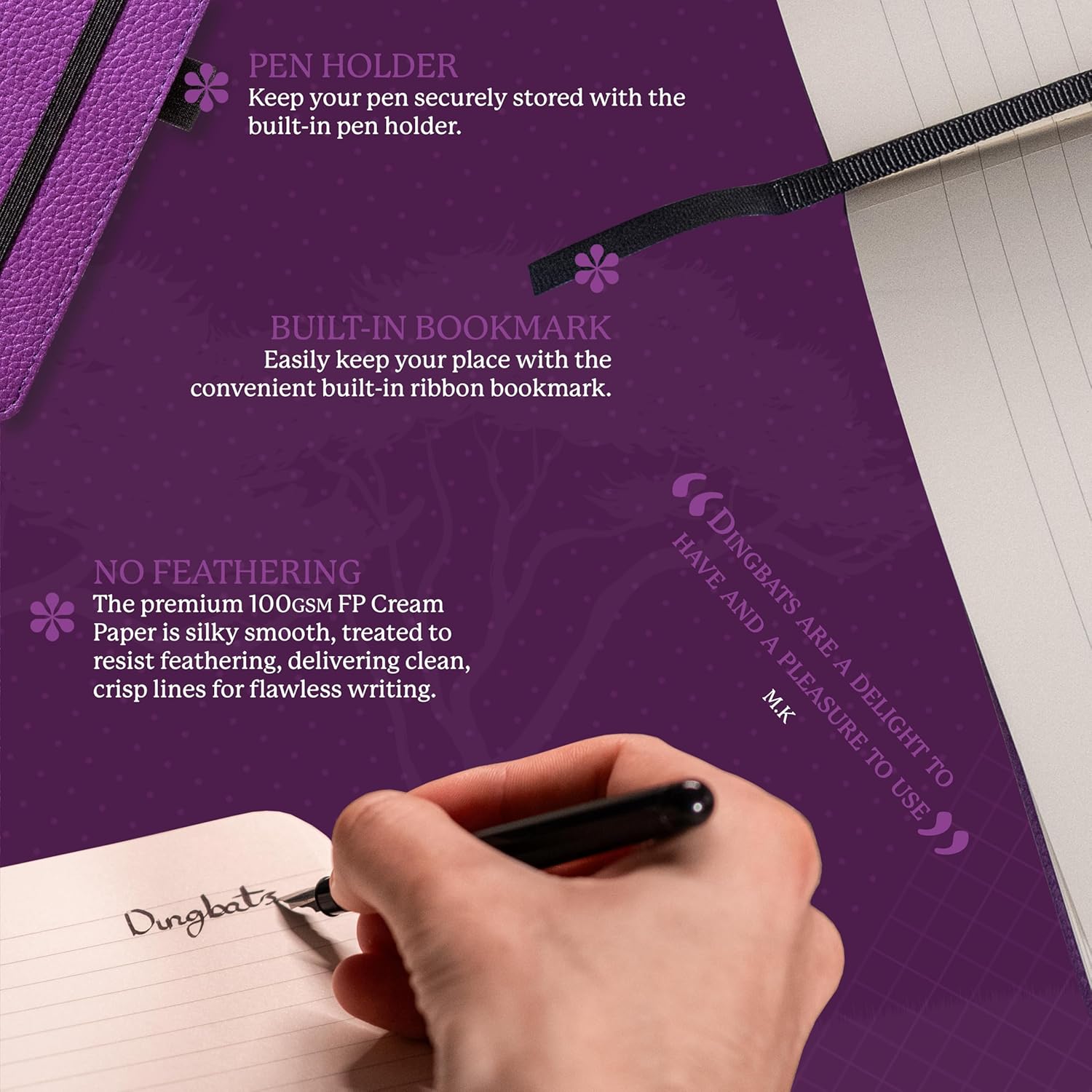 • LOTS O' FEATURES: Durable hardcover bound with PU faux leather, round corners, animal footprint endsheets, micro-perforated 100gsm cream pages, inner pocket, bookmark, a lay flat design and elastic closure. Also includes a pen holder - perfect.