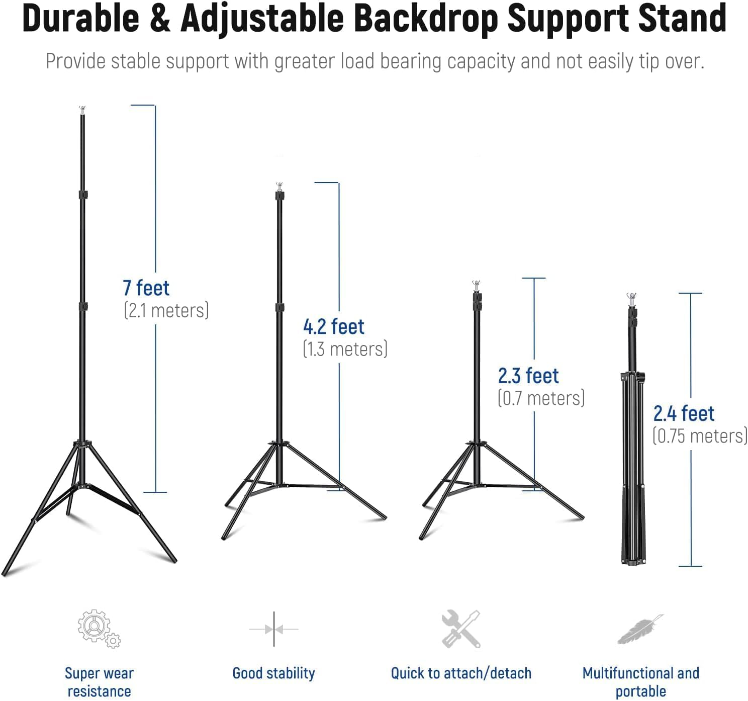 • Adjustable Height & Width: With adjustable height (27.56”–7’ / 70cm–2.1m) and width (5’–10’ / 1.5-3m), the backdrop support system holds your backdrop in place and helps you create different backgrounds for photography work