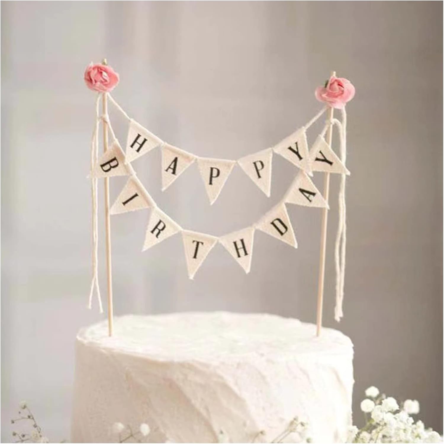 Happy Birthday Cake Bunting Topper Cake Topper Garland, Handmade Pennant Flags with Wood Pole Ivory (With Pink Rose)