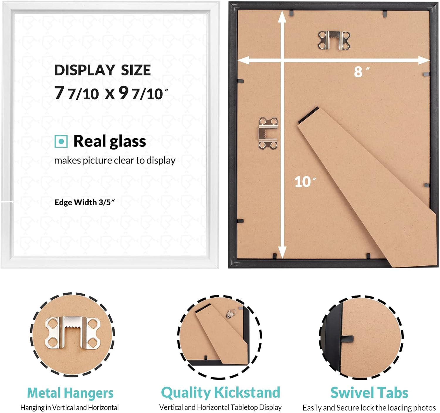 • PACKAGE INCLUDES - Set of 12 black frames, fits standard 8x10 inches pictures, photos, prints, with real glass to protect against dust and moisture. Tips: wall hooks or fasteners are not included in the package.