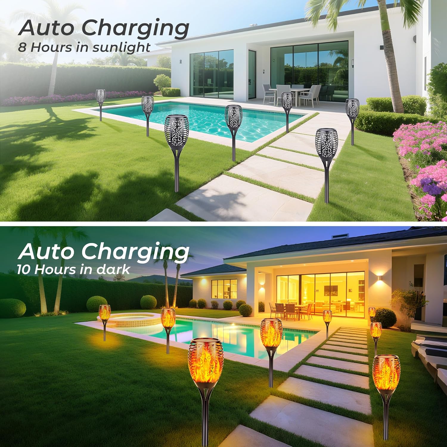 • ๐Ÿ”ฅ Long Working Time โ€“ Up to 12 Hours: Equipped with upgraded monocrystalline solar panels and a high-capacity rechargeable battery, each torch operates for up to 12 hours after a full charge. Ideal for garden parties, camping, barbecues, weddings, and seasonal dรฉcor, also a stylish decorative choice for holiday gifting.