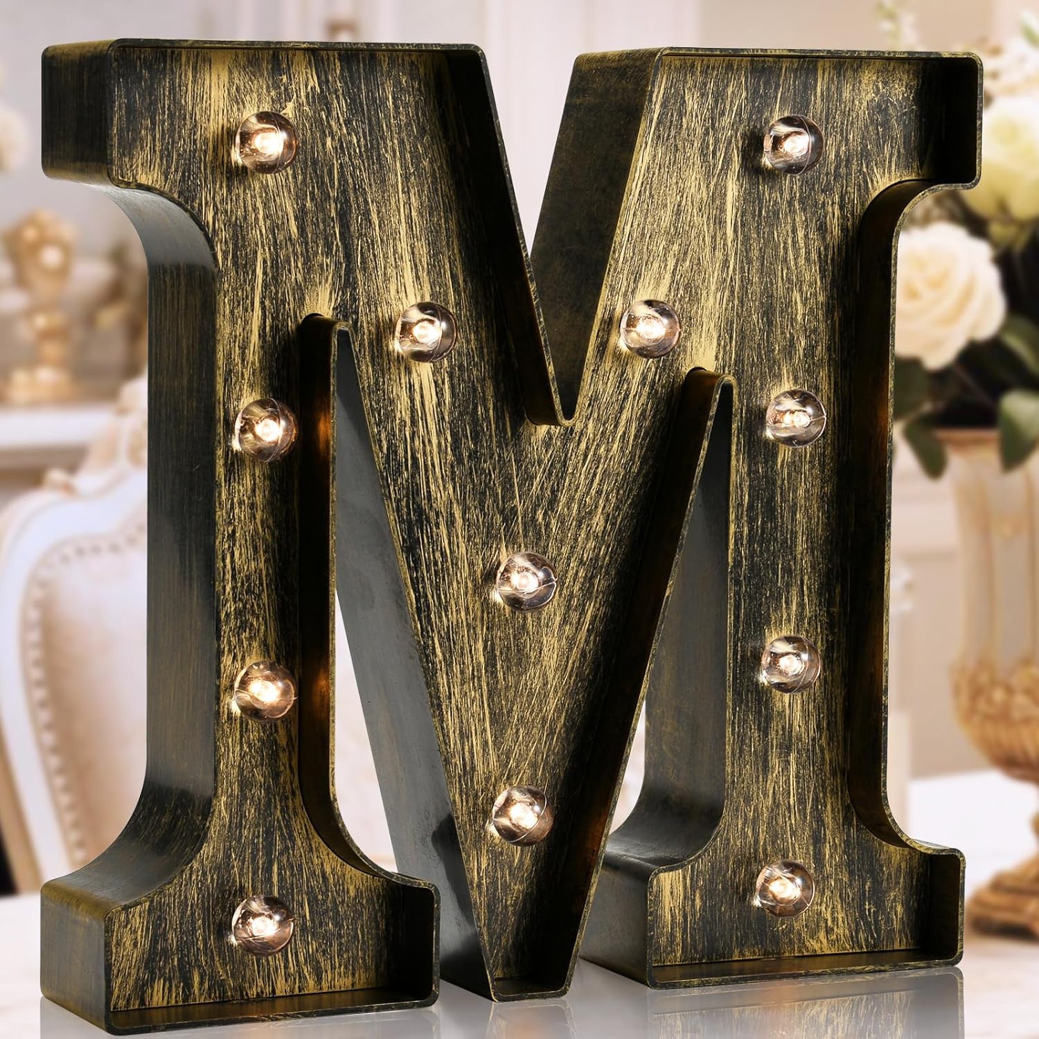 OYCBUZO Golden Black Led Marquee Letter - Industrial, Vintage Style Light Up Alphabet Letter Sign for Cafe Wedding Birthday Party Christmas Lamp Home Bar Initials Decor - M