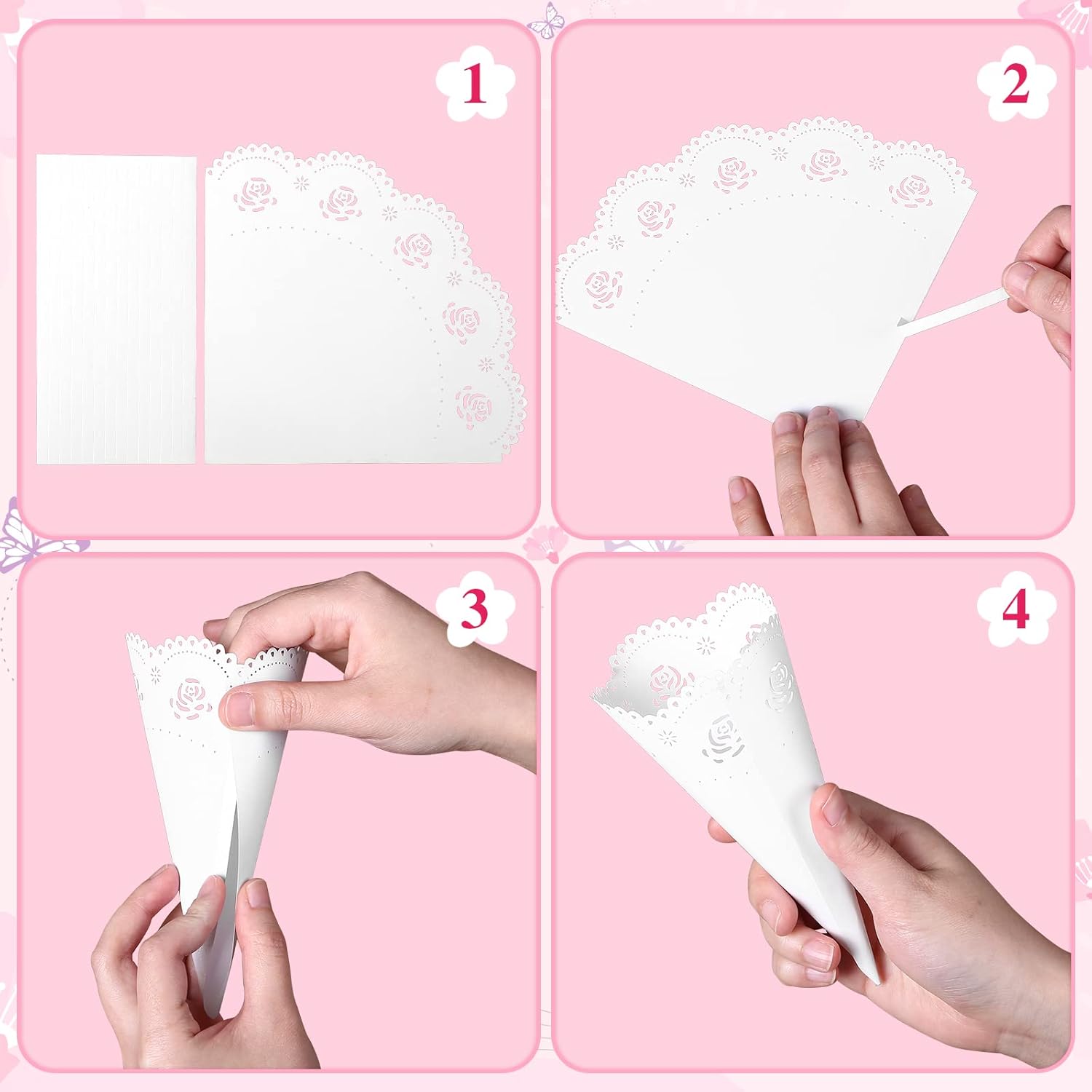 • Rose Confetti Petal Cone---Made from white lace paper doilies, exquisite and elegant