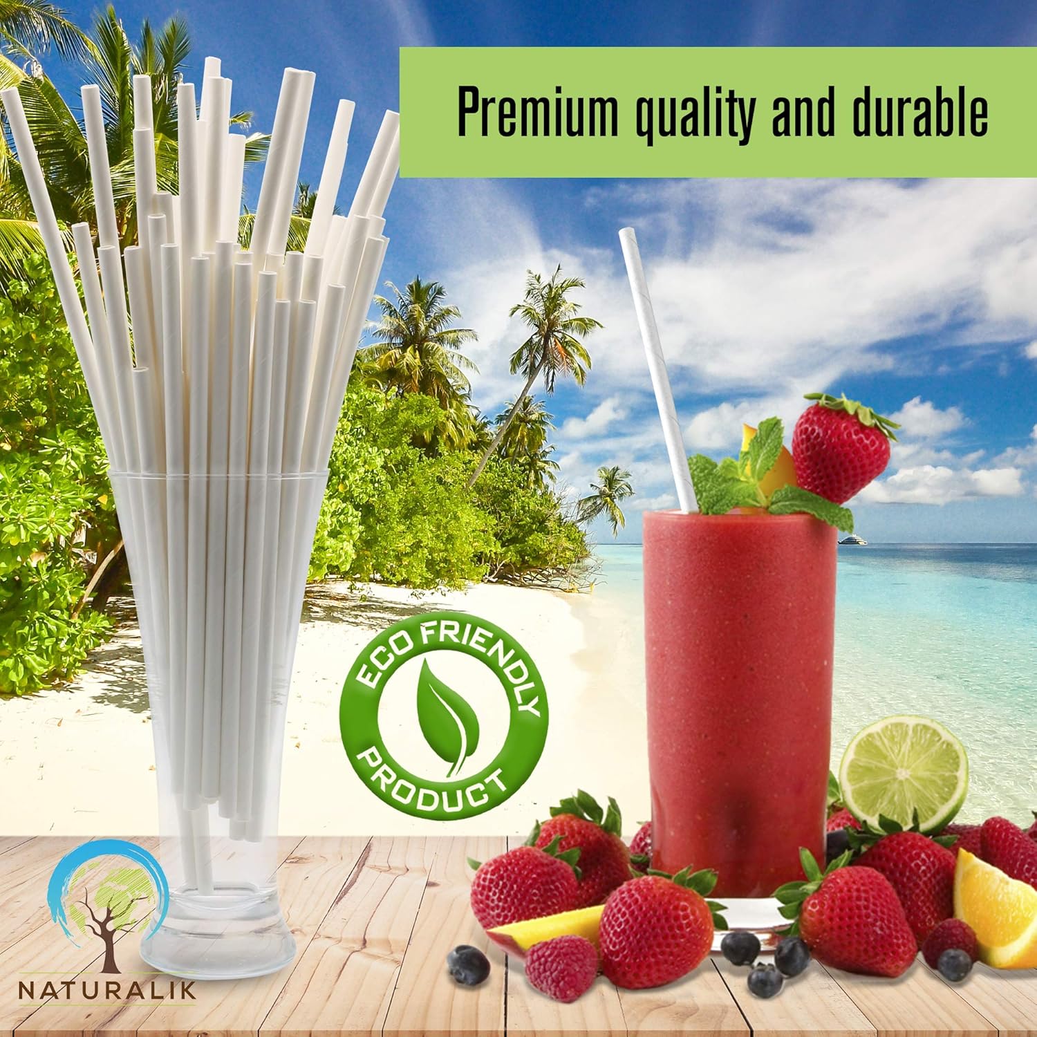 • NATURALIK 300pc Premium White paper straws made with 1/3 more material than regular paper straws which makes them extra durable and sturdier. They are dye-free, toxin free, taste and odor free. 7.75" long, 0.25" diameter. Bulk Paper Straws for Juices, Smoothies, Party Decorations and Restaurants. Also available in bulk packs of 1000pc. Search B07NTLGWDB on Amazon.com