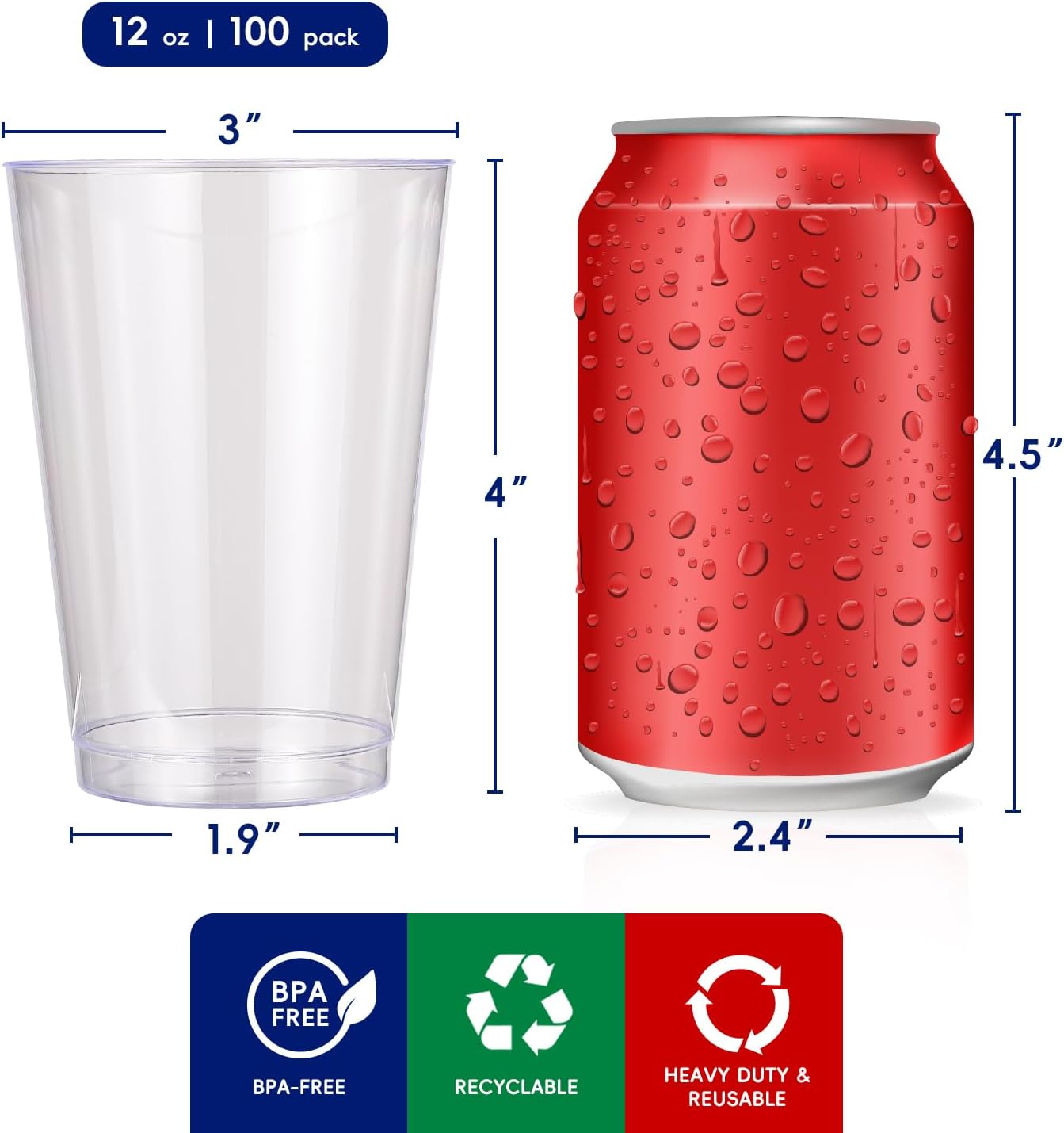 JOLLY CHEF 12 oz Clear Plastic Cups, 100 Pack Heavy-duty Party Glasses, Disposable Plastic Cups for Halloween,Thanksgiving Day, Christmas Party
