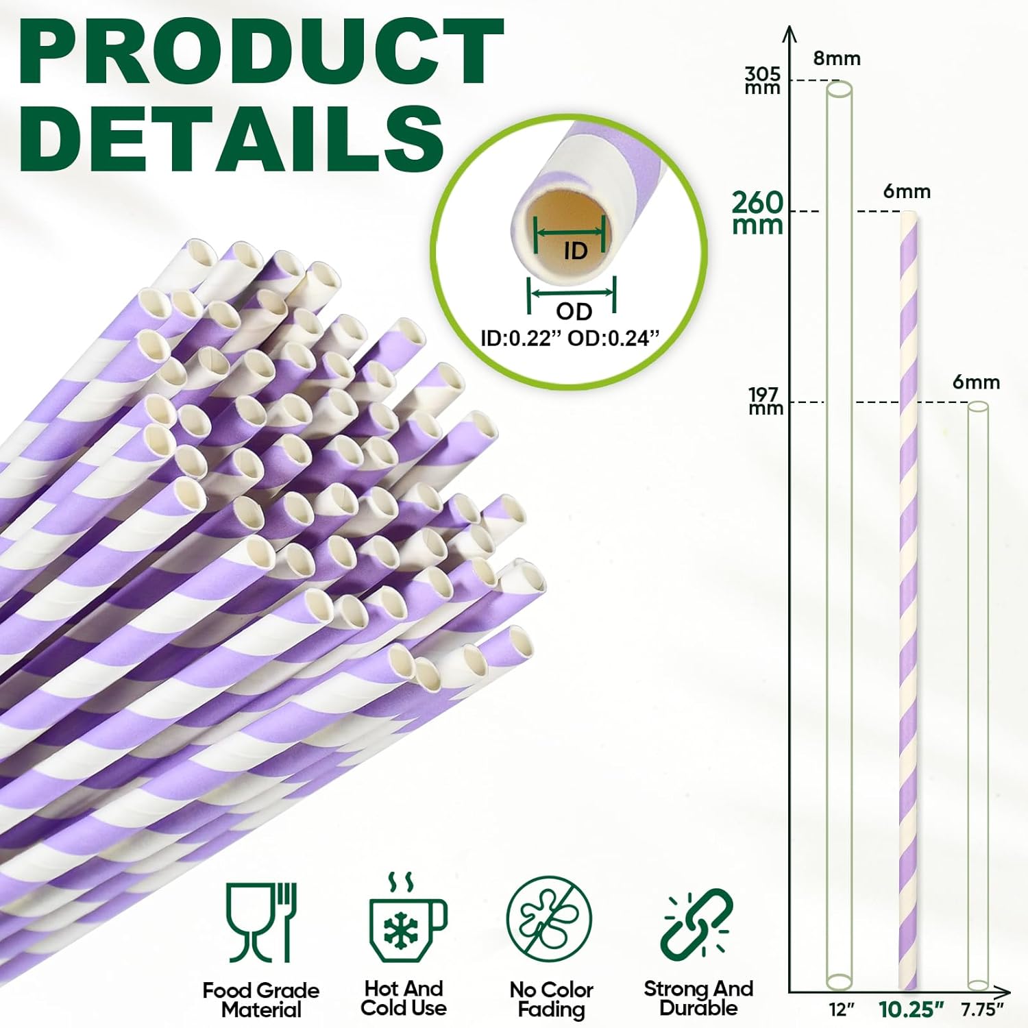 Compostable Paper Drinking Straws 10 Inch Long, for 20oz to 32oz Tumblers - Purple, Pack of 100