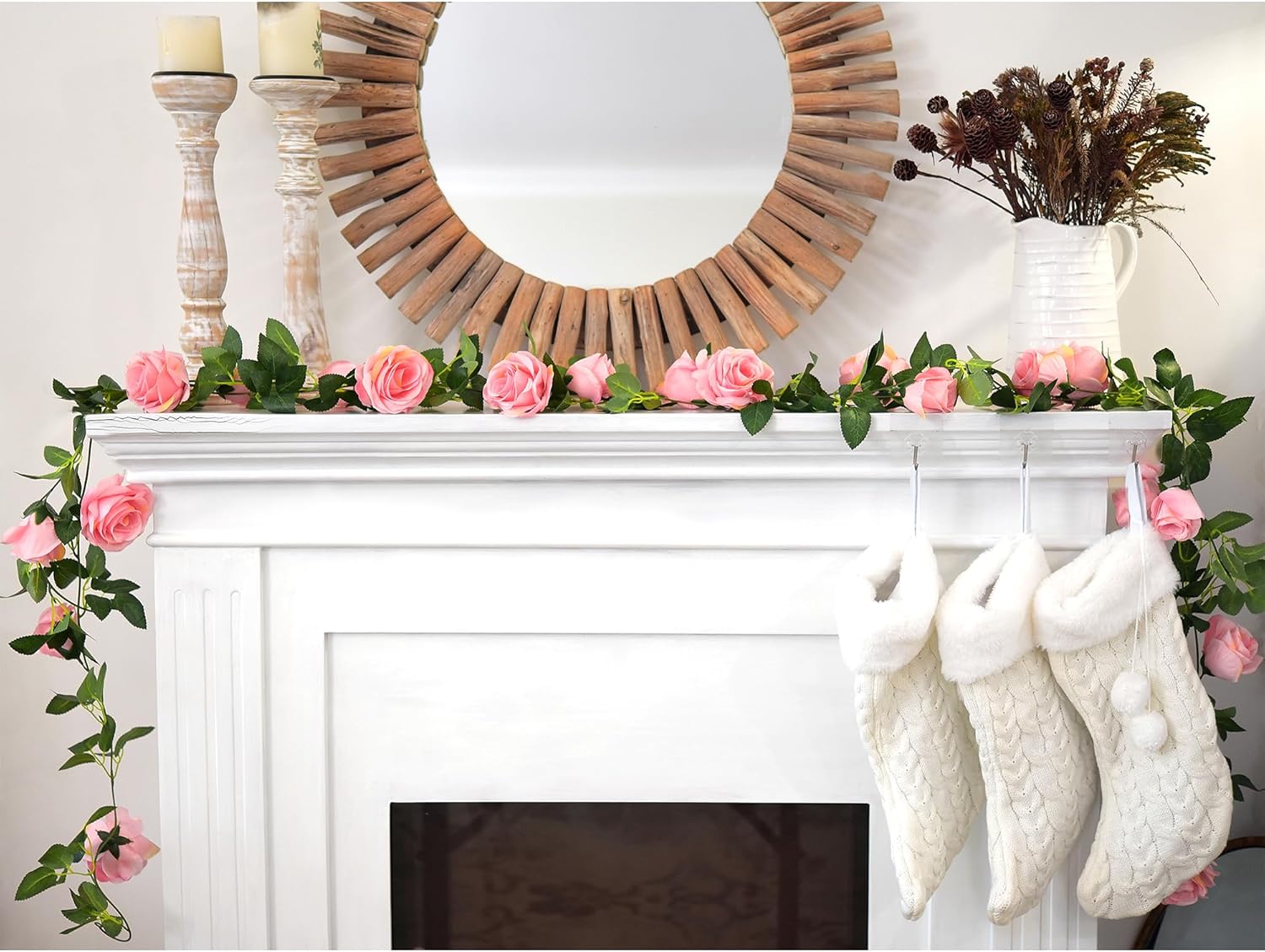 • Each strand has integrated loops at both ends for easy hanging—use individually or connect for a full-length display; Roses and leaves are made from soft silk blend with flexible PE vine; Color may vary slightly under lighting or monitor settings; Garlands may arrive compact due to packaging—please fluff gently to restore volume; Petal shedding may occur during unpacking and is normal; Ships in protective FiveSeasonStuff branded packaging.