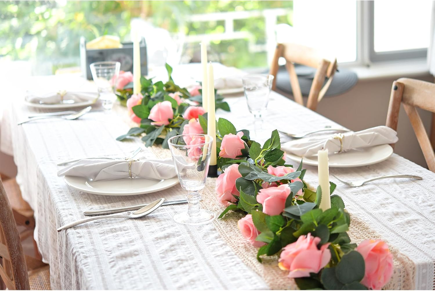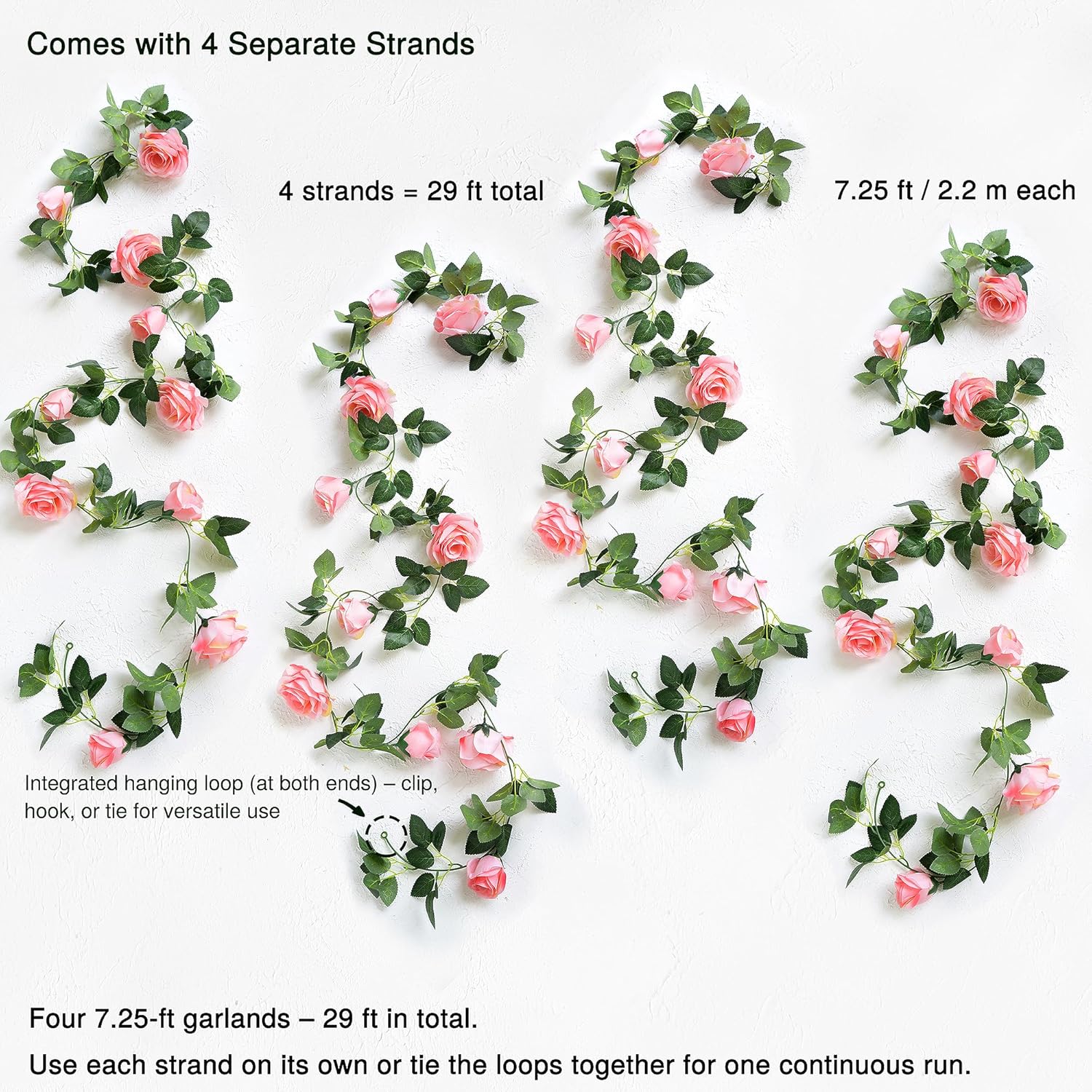 • Each set includes 4 individual artificial rose garlands, each approximately 7ft long, totaling 28ft when combined. Each strand is bundled separately and must be fluffed and joined to achieve full 28 ft length;