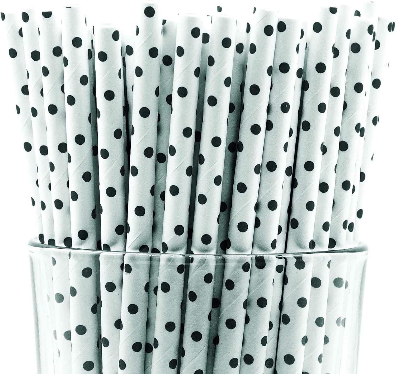 • Pack of 300 Black Polka Dot paper straws that are 7.75” long and have a diameter of 0.25”. Made with 4-ply paper which translates into thicker and more resilient straws that won’t wilt or change shape in both hot and cold drinks.