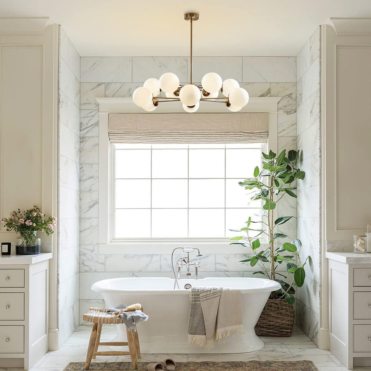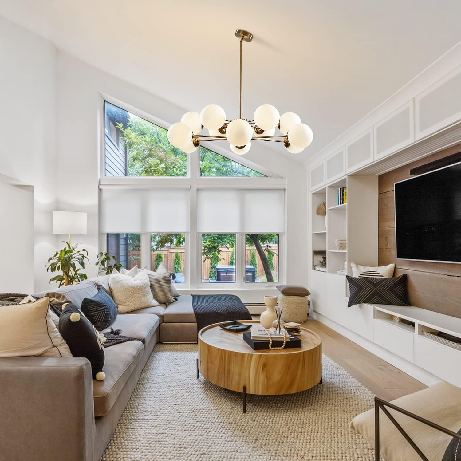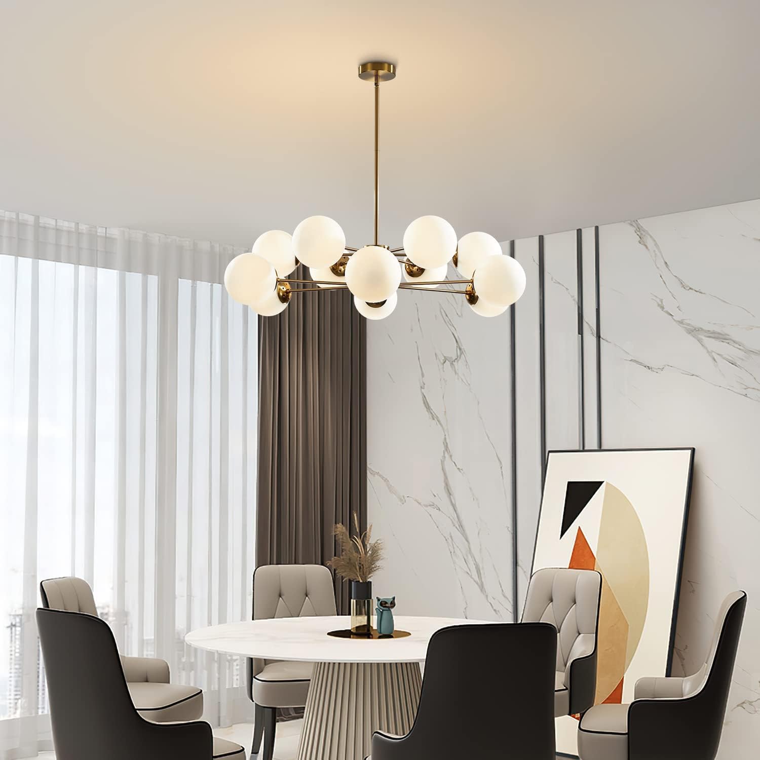 • Modern Glass Globe Chandelier Light Fixture: The gold 12-light sputnik chandeliers composed with milk glass globe lampshade and hanging stems, it's elegant and creative and creates a modern and vintage atmosphere. The classic globe design gives a beautiful and luxurious visual enjoyment