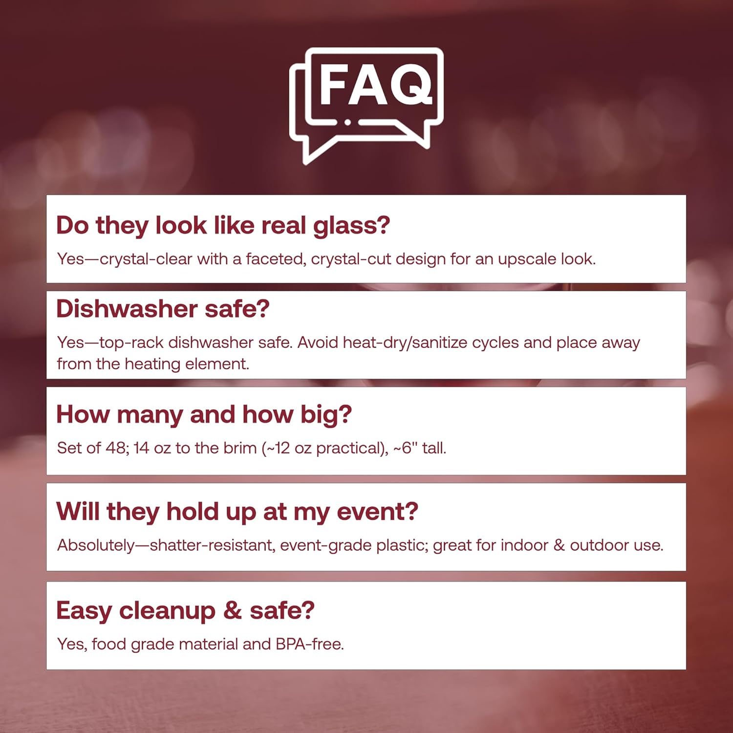 • PACK & SPECS: Set of 48 clear crystal-cut tumblers (12 packs of 4). Flush fill 14 oz, practical 12 oz; approx. 6" tall, 2.5" top dia, 3" base. Sturdy walls and a stable footprint make these 14 oz plastic cups service-ready for busy bars and buffets.
