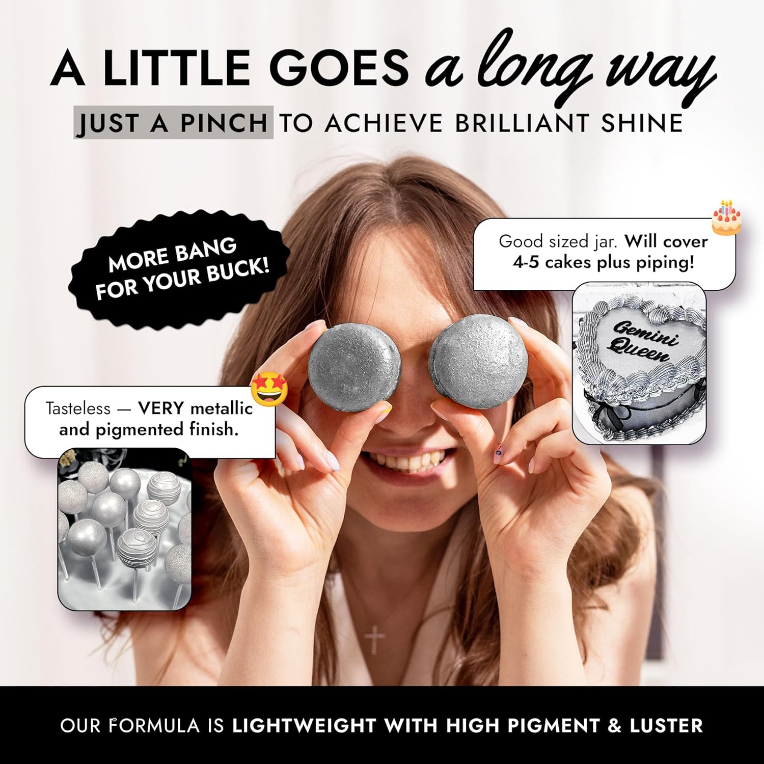 • EASY TO USE: Our silver luster dust is incredibly versatile. Apply with a wet brush, airbrush, or dry brush, and even mix into beverages. Achieve professional-looking results effortlessly at home, whether decorating halloween cakes or adding shimmer to cocktails.