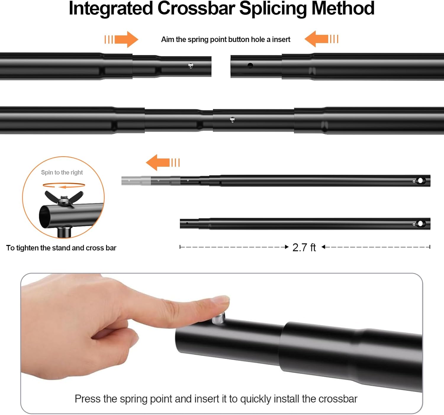 • 【Stable & Adjustable】Aluminum alloy structure brings stability and durability. Height-adjustable background support stand (from 3 ft to 8.5 ft) can be split and folded, and can be disassembled into two crossbars and two tripods. Integration Telescopic Cross Bar, width extendable from 5 ft to 10 ft. The joint comes with 1/4-inch screw tip, compatible with most type stand