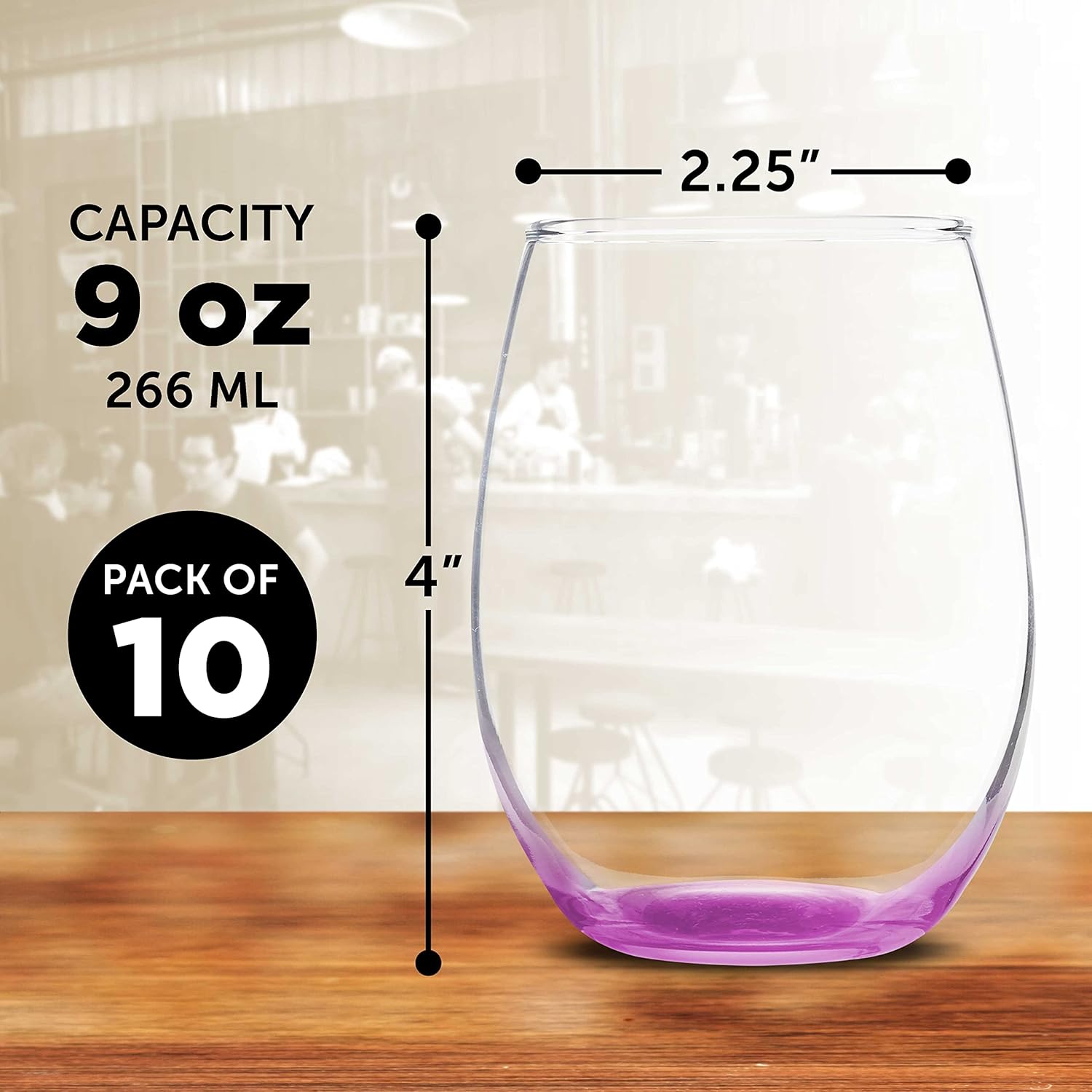 • CUSTOMIZABLE & AVAILABLE IN VARIOUS COLORS - Available with a base in clear, blue, black, green pink, red, or purple. Order our stemless wine glasses etched or engraved and add your brand name, logo, and event dates. Or purchase blank and enhance your décor.