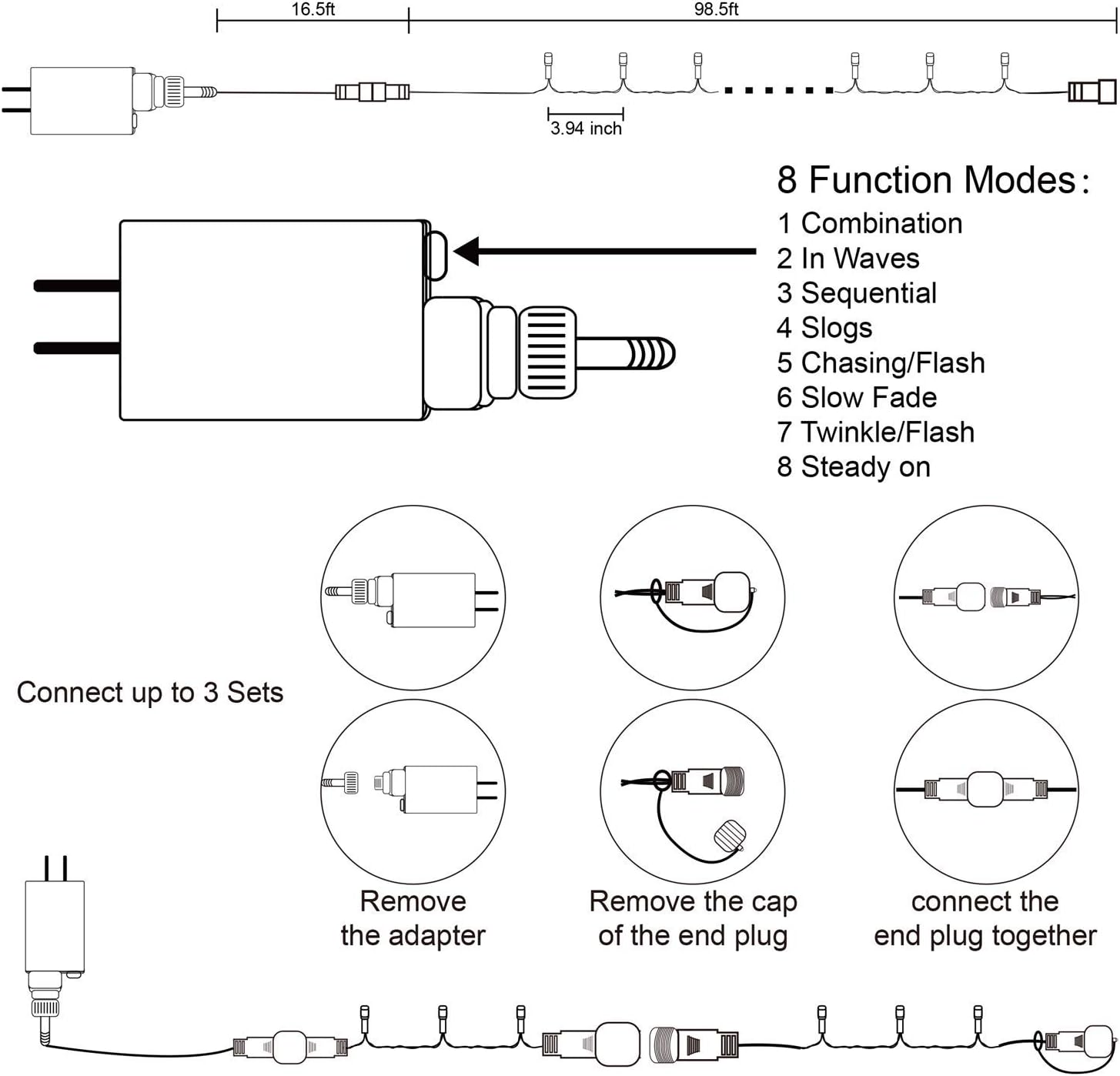 • 29V low voltage string lights: Keep at a low temperature state after lighting up for hours, ensure and maximize the safety. Directly plug in and unplug it for power on and off. US standard outlet, voltage 110V. Adapter to the first LED light: 16.5ft. Total length(lights string and leading line): 115ft.