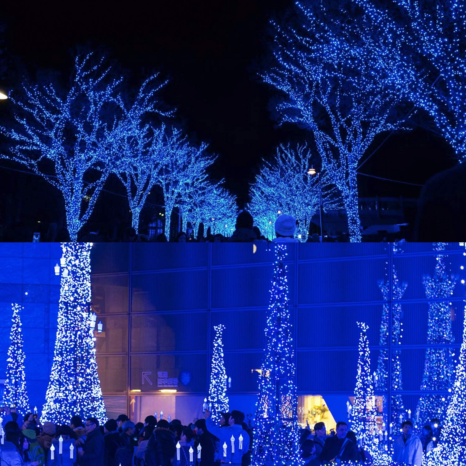 • 98.5ft Christmas Decorations string lights: With 300 Blue individual LED bulbs. Each lights has end-to-end connection, you can connect up to 4 sets together to illuminate a wider range.