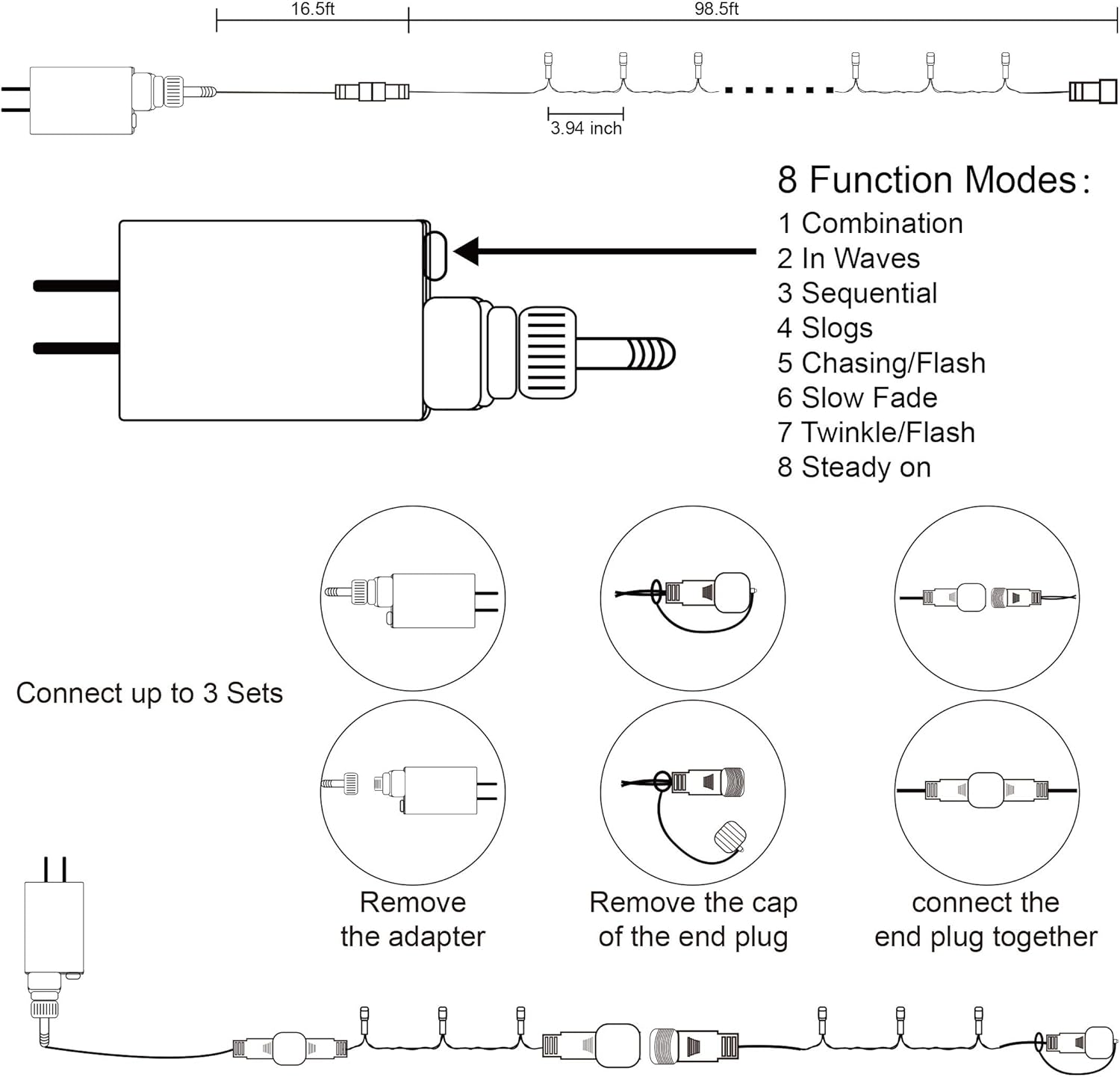 • 98.5ft Christmas Decorations string lights: With 300 multicolor individual LED bulbs. Each fairy string lights has end-to-end connection; you can connect up to 3 sets together to illuminate a wider range.