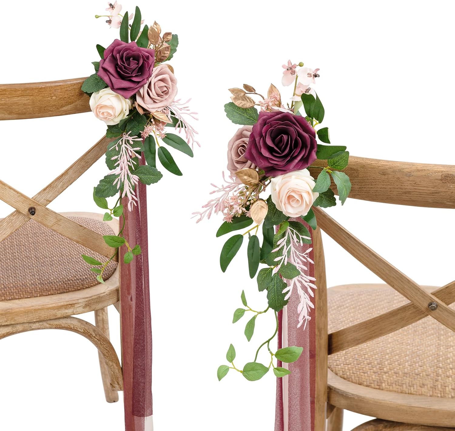 • WEDDING AISLE DECOR DETAILS: 8 pcs pre-made fake aisle marker pew flowers and 8 double-color ribbon card sets, which helps to create your romantic fall, marsala or winter wedding. Aisle suitable for four rows of guest seating. If there are more queues, it is recommended to purchase multiple copies.