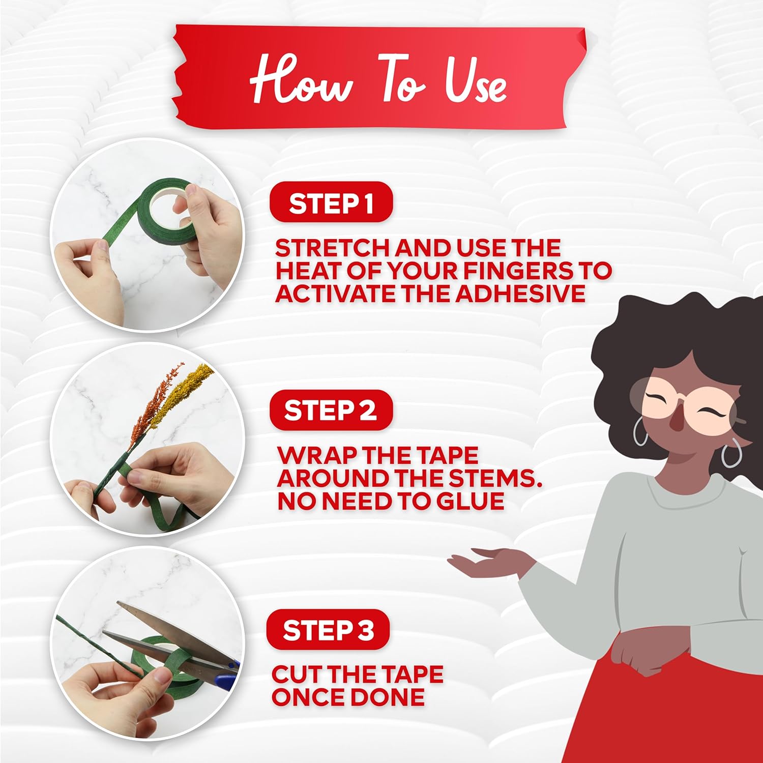 • Green florist tape features a mess-free and easy-to-handle wax layer that fuses to itself when stretched, resulting into neat applications, EMPOWERING the average user with LITTLE TO NO experience in flower and bouquet arrangement to ACHIEVE PROFESSIONAL-GRADE results!