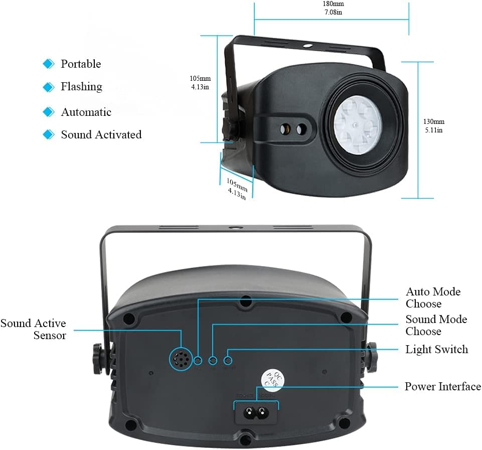 • 【Portable LED Decorative Projector Lights Sound Activated】: Plug ON and fun start.It can play through pre-programmed automatic light shows or can dance to the music thanks to the integrated microphone.Adjustable bracket for use on flat surface&ground to illuminate dj facade booth or mounting on the wall&ceiling&truss&setup stand. The compact size is great for moving around as well to creat lighting show.