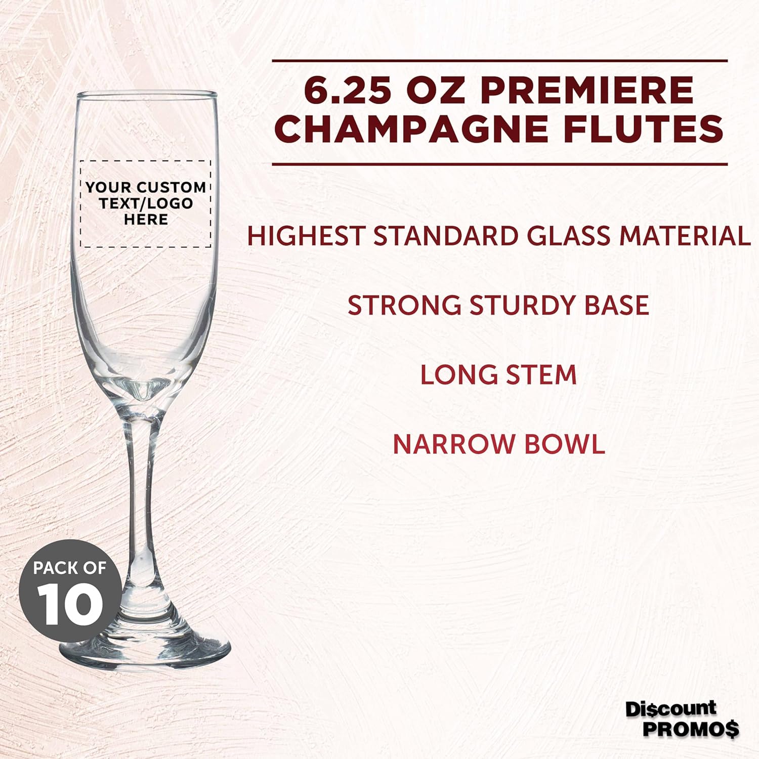 DISCOUNT PROMOS Custom Premiere Champagne Flutes 6.25 oz. Set of 10, Personalized Bulk Pack - Elegant Drinkware for Weddings, Events, & Promotional Gifts - Clear