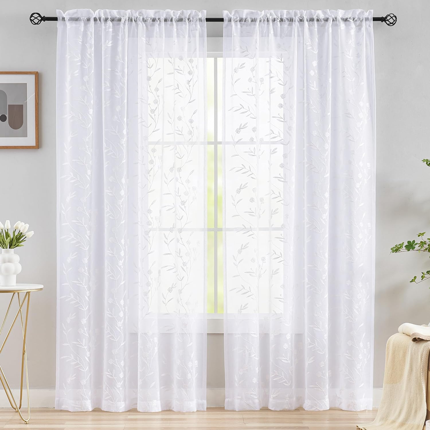 Embroidery Sheer Curtains White 95 Inches, Floral Pattern Window Treatments Rod Pocket Drapes for Living room, Bedroom, Semi Voile Curtain Panels for Yard, Patio, Villa, Parlor, Set of 2, 52"x 95".