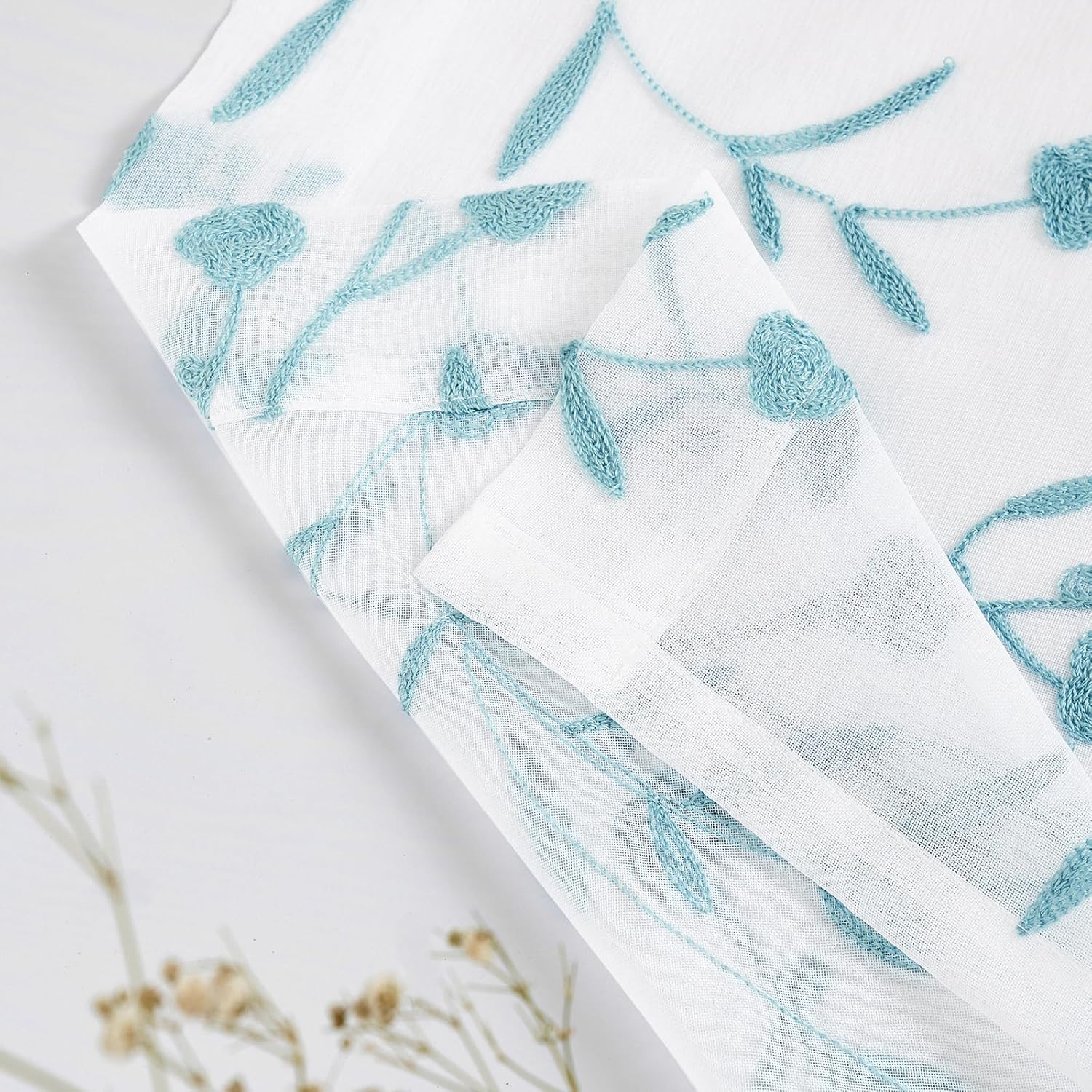 Sheer Curtains White-Blue 45 Inches Long Floral Embroidery Rod Pocket Voile Drapes for Living room, Bedroom, Window Treatments Semi Lace Outdoor Curtain Panels for Yard, Kitchen, Set of 2, 52"x 45".