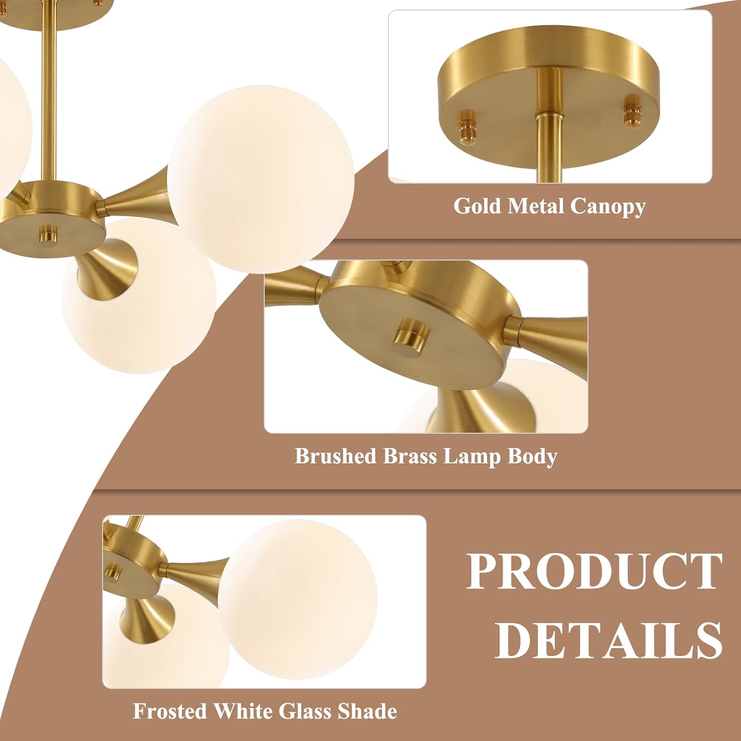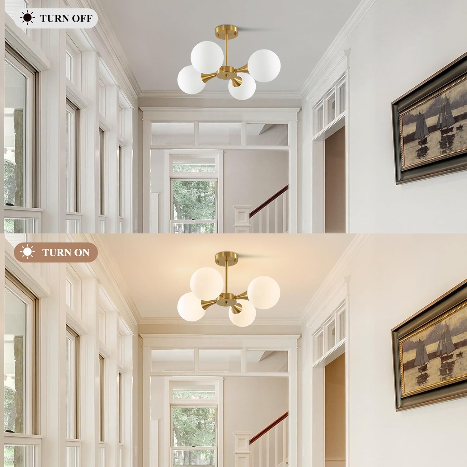 KCO Lighting Modern Globe Ceiling Light Gold Semi Flush Mount Sputnik Chandelier Mid Century Frosted Glass Ceiling Lamp for Living Room Dining Room Bedroom (4-Light)