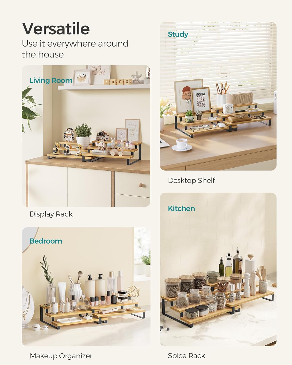 • 【FIND AT A GLANCE】With its specially designed tiered structure and each tier being 3" deep, this display riser ensures all your spice jars and items are clearly visible and easily accessible, preventing messes and keeping your kitchen organized