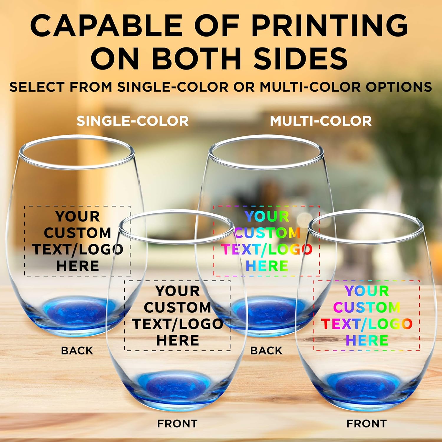 • CUSTOMIZABLE & AVAILABLE IN VARIOUS COLORS - Available with a base in clear, blue, black, green pink, red, or purple. Order our stemless wine glasses etched or engraved and add your brand name, logo, and event dates. Or purchase blank and enhance your décor.
